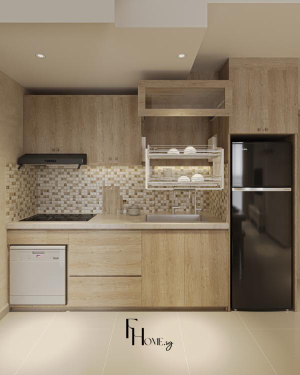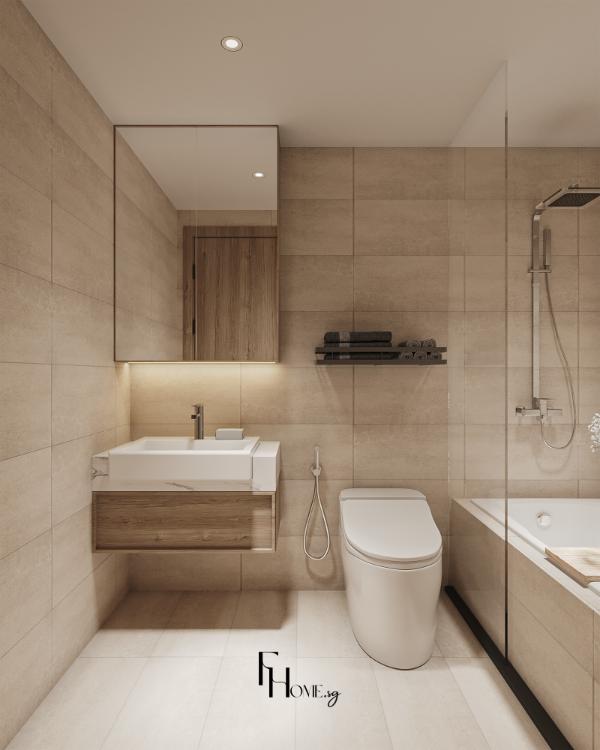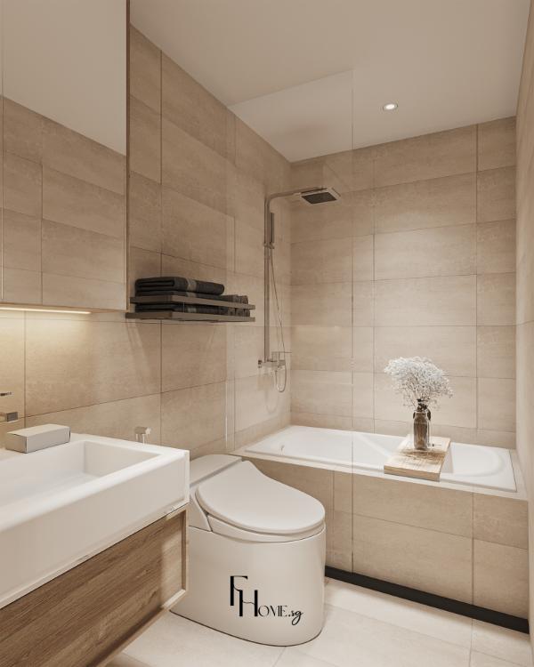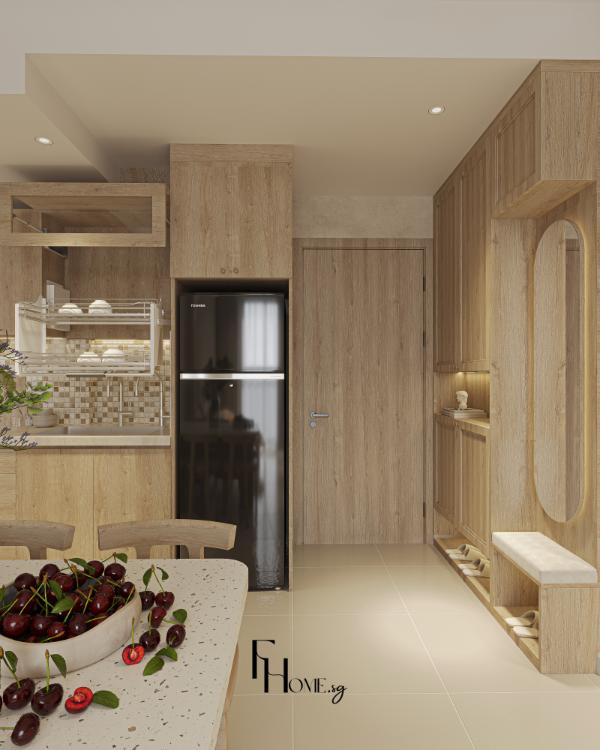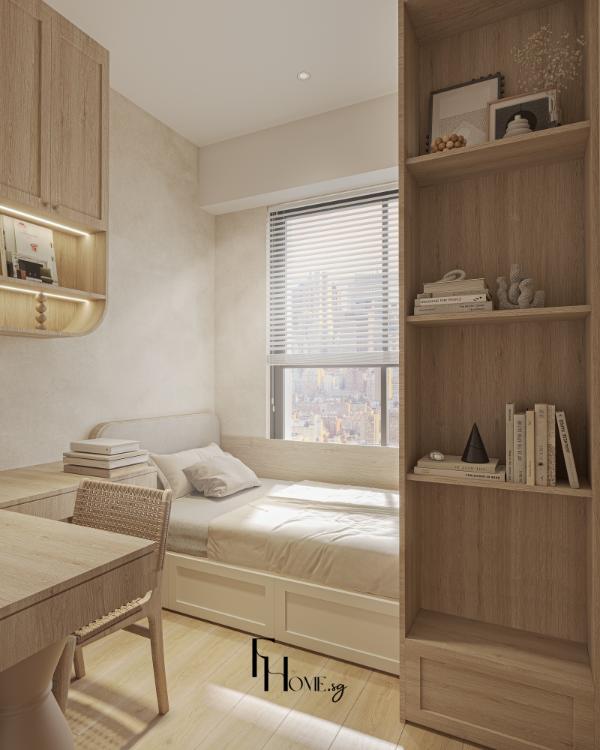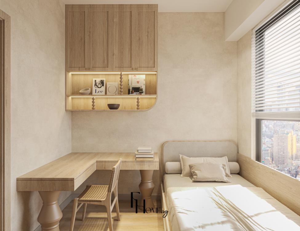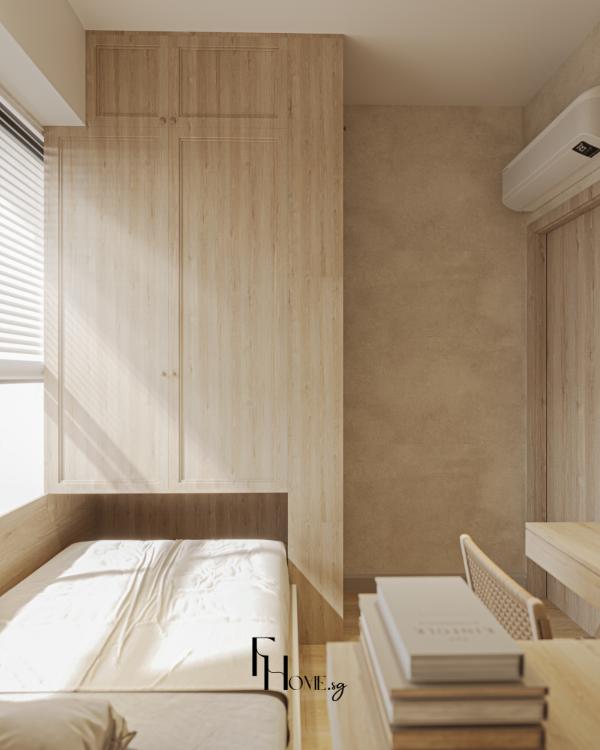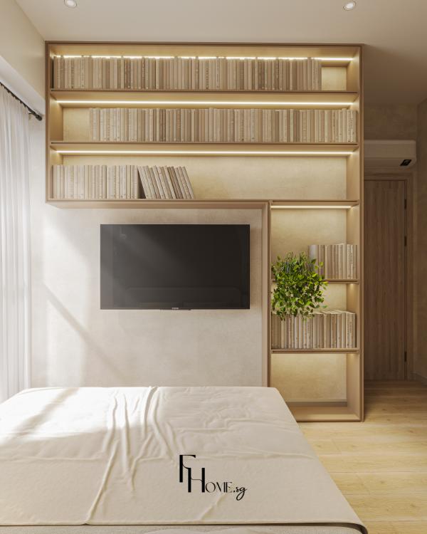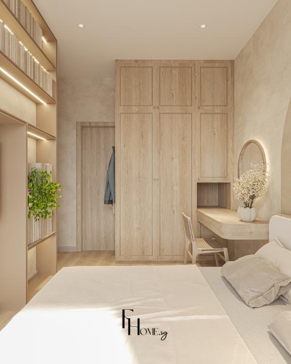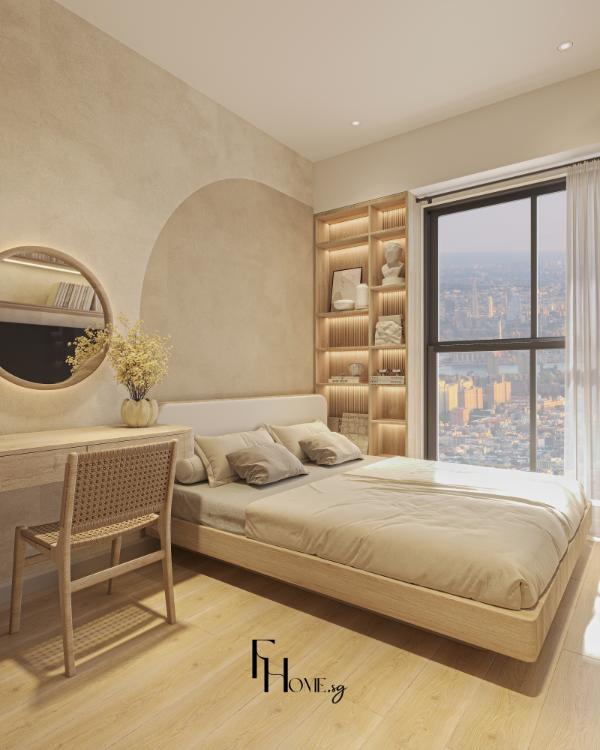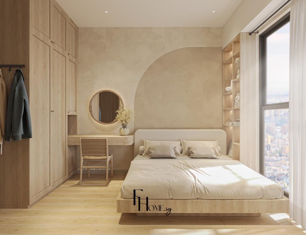 • Sản xuất: Các hạng mục nội thất “”may đo”” như hệ giường bục, tủ quần áo kịch trần và các chi tiết vòm cong trang trí được đo đạc, gia công chính xác và kiểm soát chất lượng nghiêm ngặt trực tiếp tại xưởng FHome.sg
