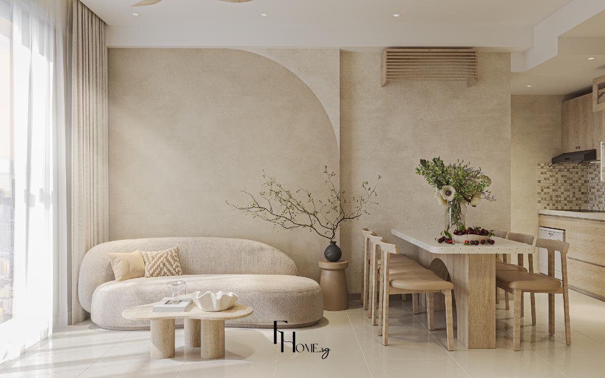 • Xóa nhòa cảm giác chật hẹp bằng cách sử dụng đồng bộ một tông màu be đất từ sàn, tường đến trần. Sự liền mạch về màu sắc giúp đánh lừa thị giác, khiến căn hộ trông rộng rãi và sáng sủa hơn.