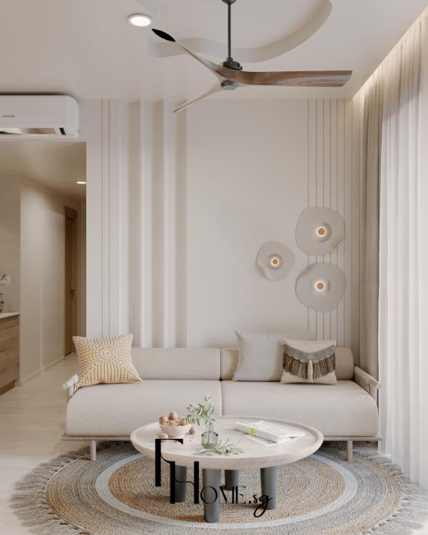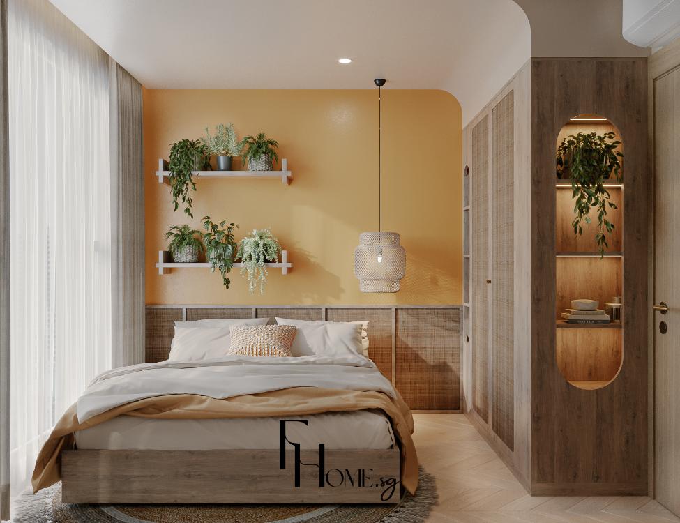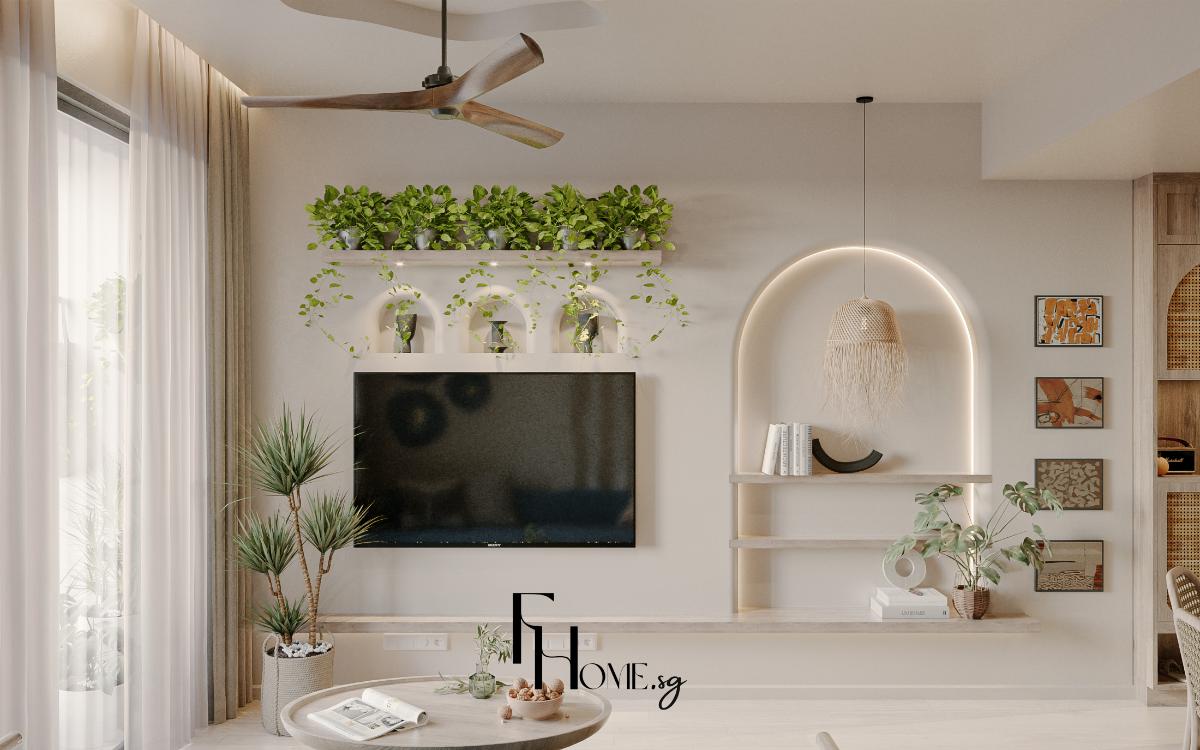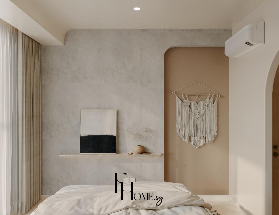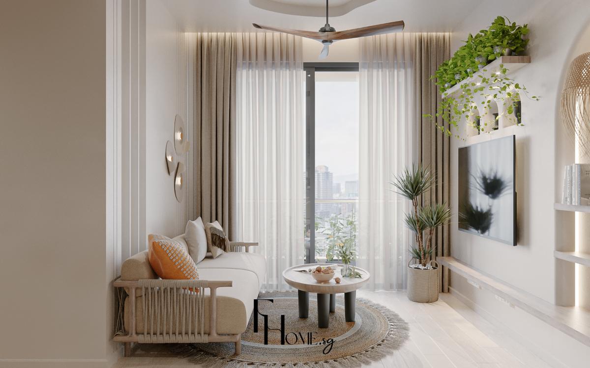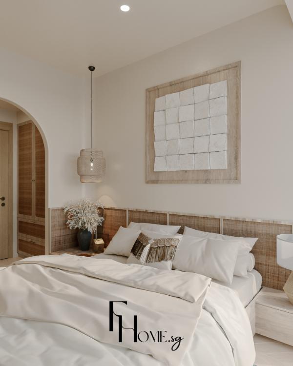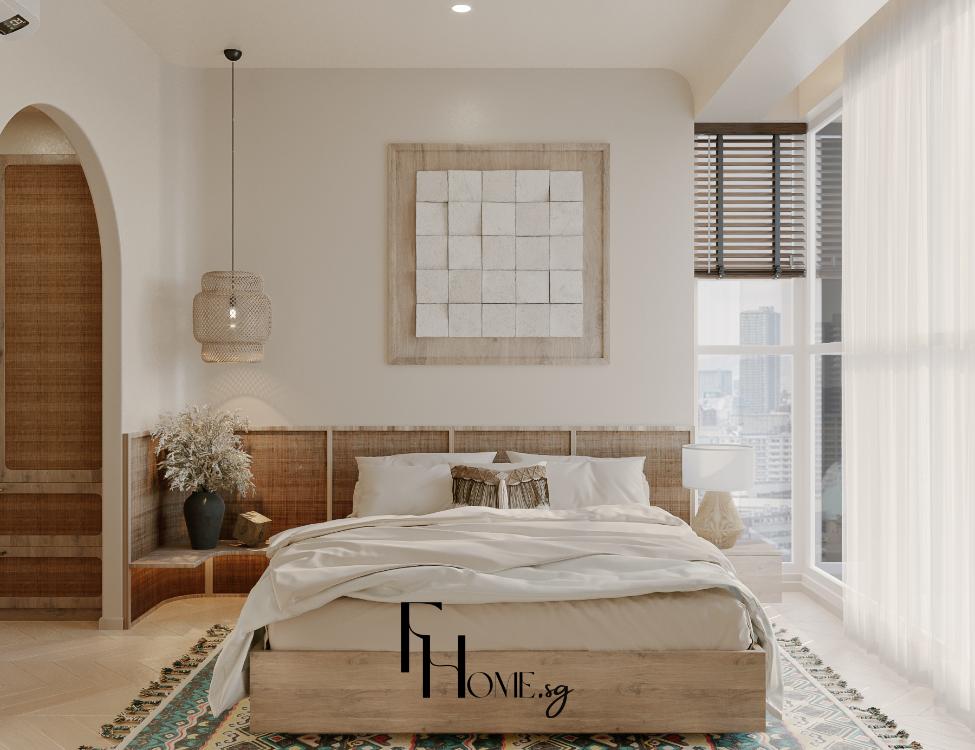 • Khắc phục Thẩm mỹ: Sử dụng bảng màu Beige/Gỗ sáng kết hợp Phào chỉ Panel dọc nhằm tạo cảm giác không gian rộng, tạo độ sâu, thể hiện trọn vẹn sự tinh tế và ấm cúng của phong cách Bohemian.