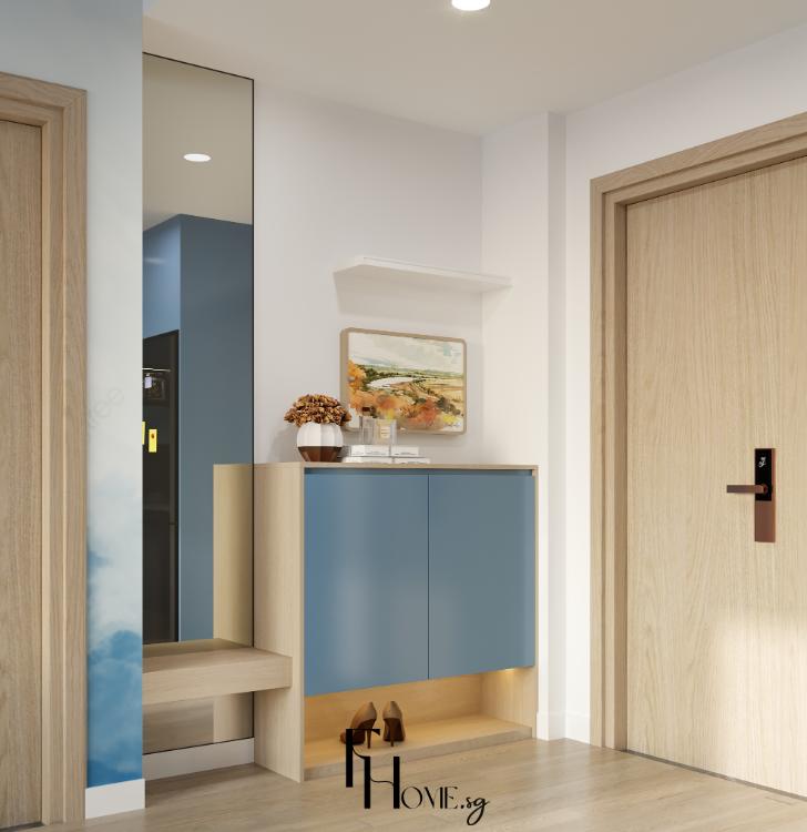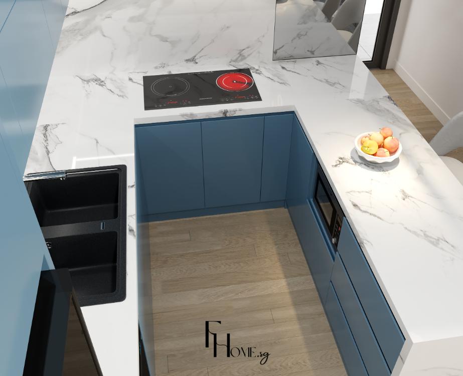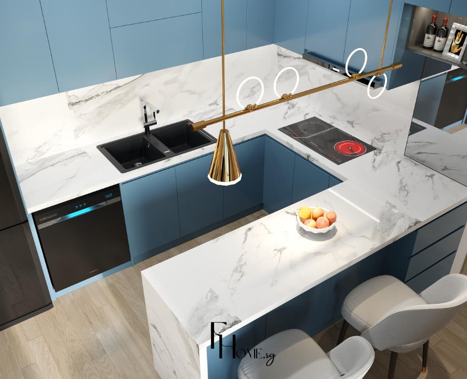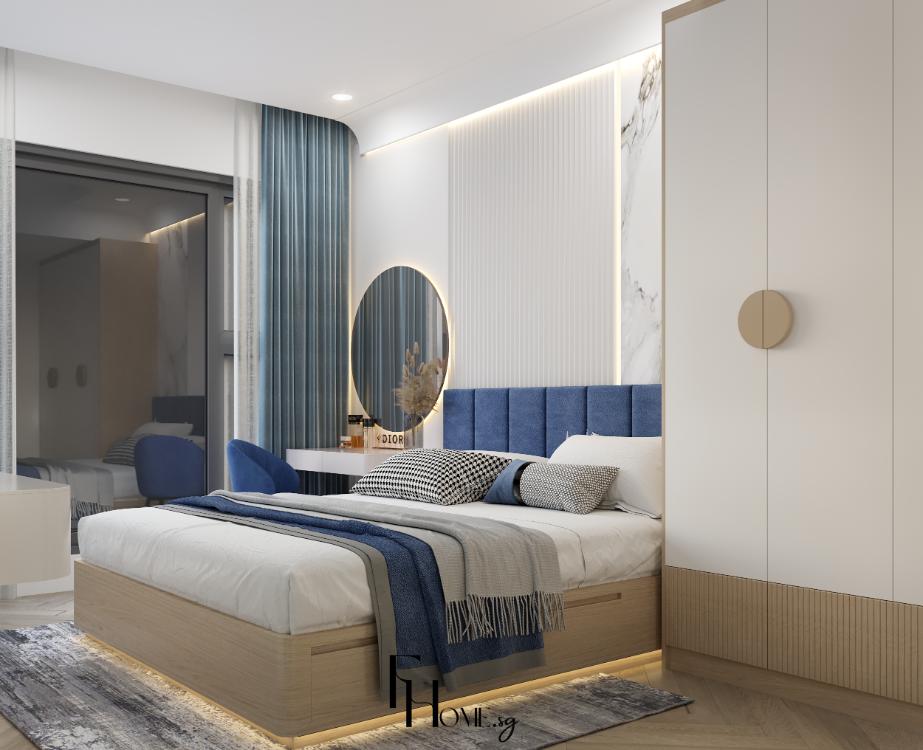 - Sản xuất: Các hạng mục nội thất đặc thù như hệ tủ bếp chữ U, vách ốp tạo hình sóng biển và bàn phấn thông minh được đo đạc, gia công chính xác và kiểm soát chất lượng nghiêm ngặt trực tiếp tại xưởng FHome.sg.”