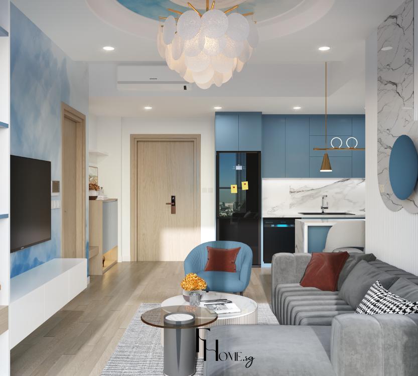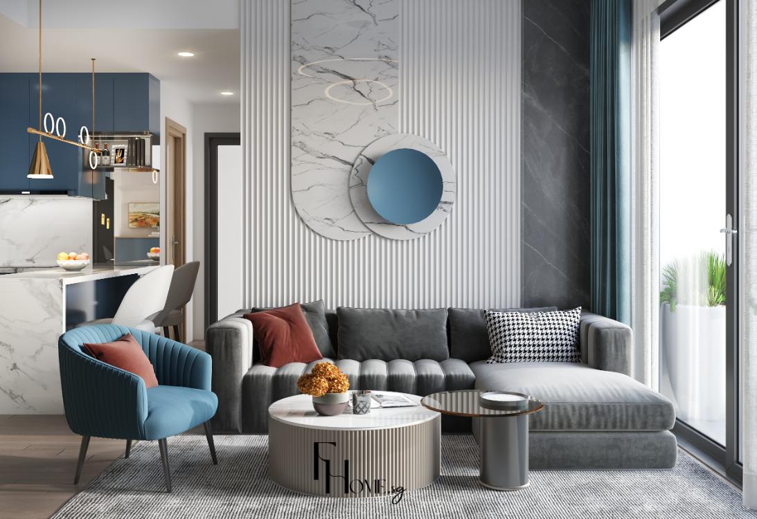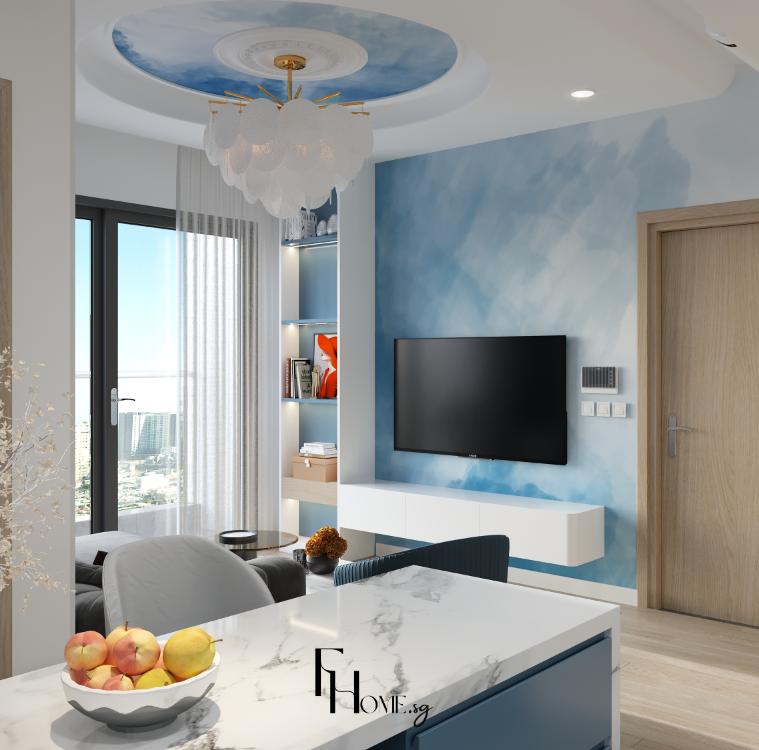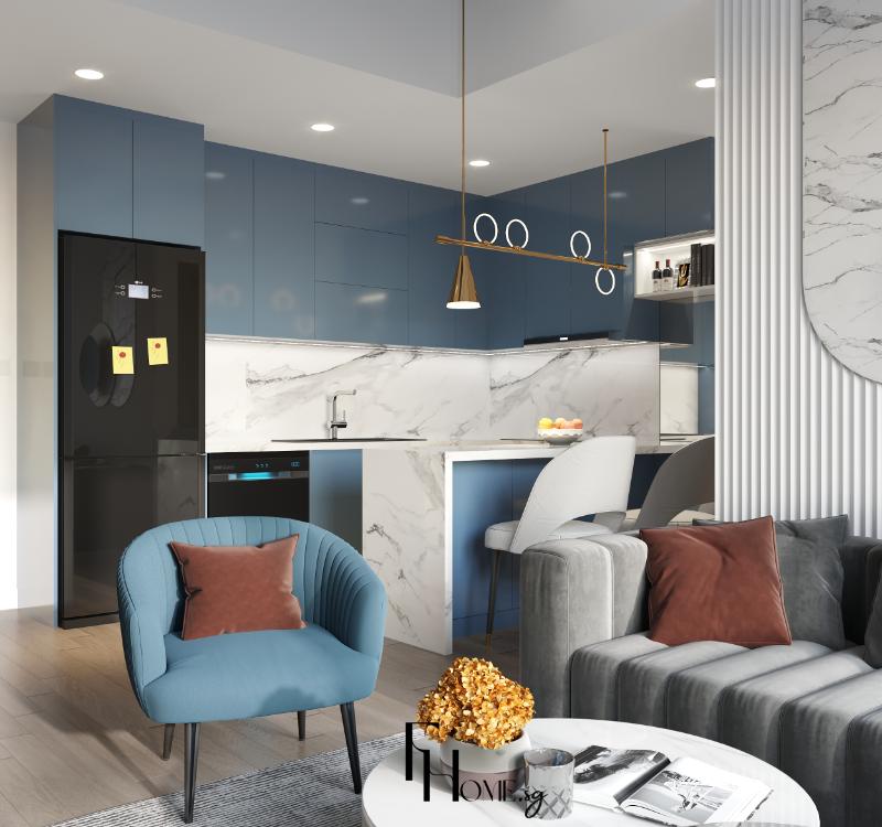 Thách thức: Yêu cầu của gia chủ là đưa hơi thở của biển cả vào căn hộ 75m2 nhưng phải giữ được sự sang trọng, hiện đại, tránh cảm giác lạnh lẽo hoặc rườm rà. Đồng thời, cần tối ưu hóa không gian lưu trữ và góc làm việc trong các phòng ngủ có diện tích giới hạn.