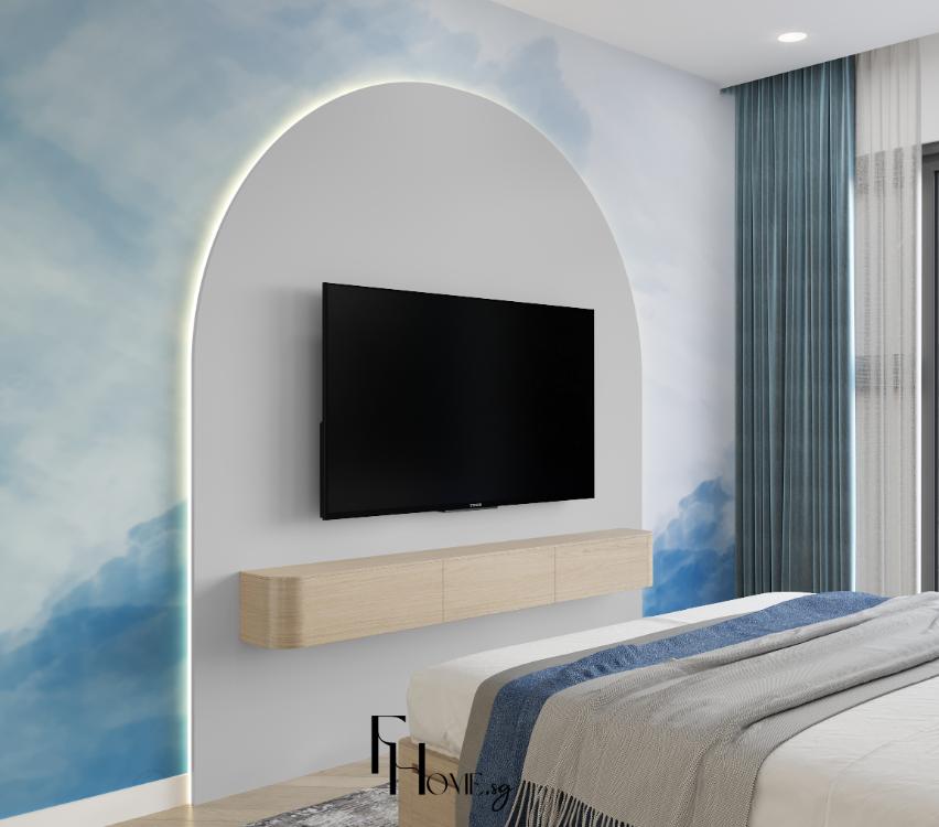 - Khắc họa vẻ đẹp đại dương bằng kỹ thuật sơn hiệu ứng Ombre (chuyển màu) và tạo hình vòm cong trên các diện tường. Thủ pháp này mô phỏng những con sóng mềm mại, tạo chiều sâu thị giác và cảm giác thư thái tuyệt đối mà không cần dùng quá nhiều chi tiết trang trí.