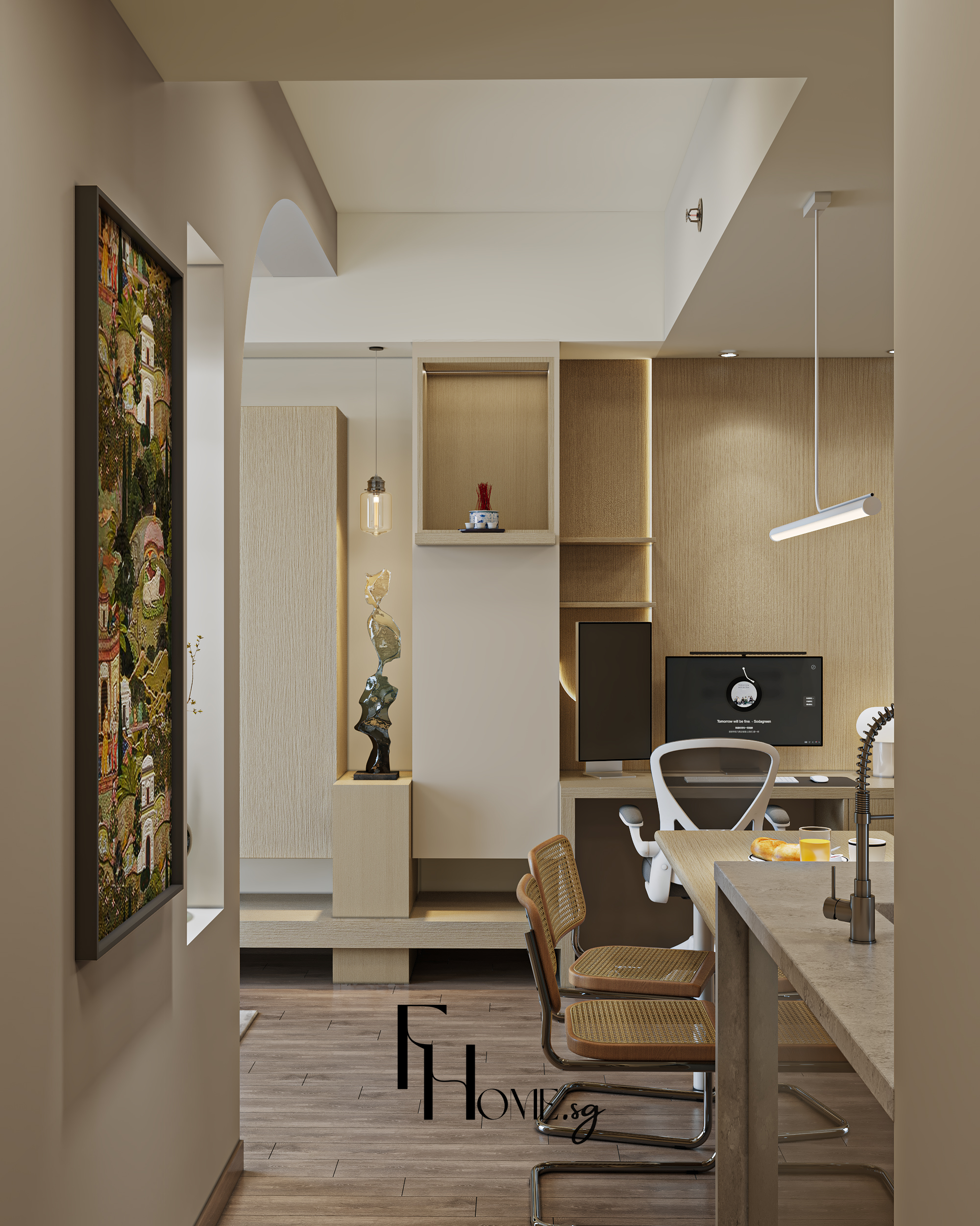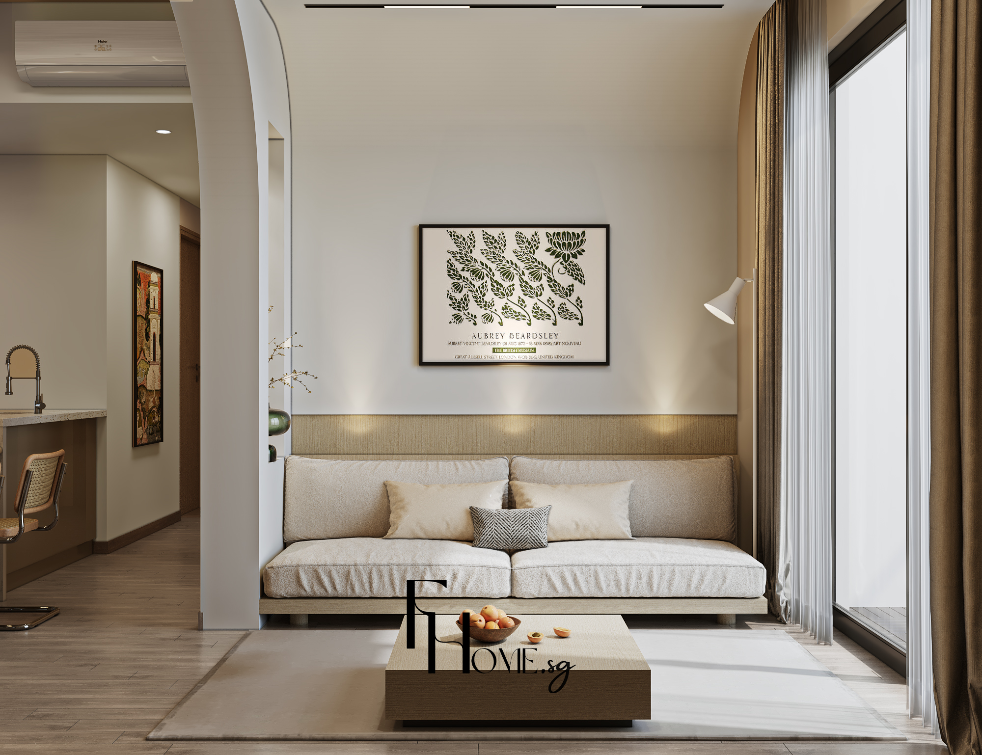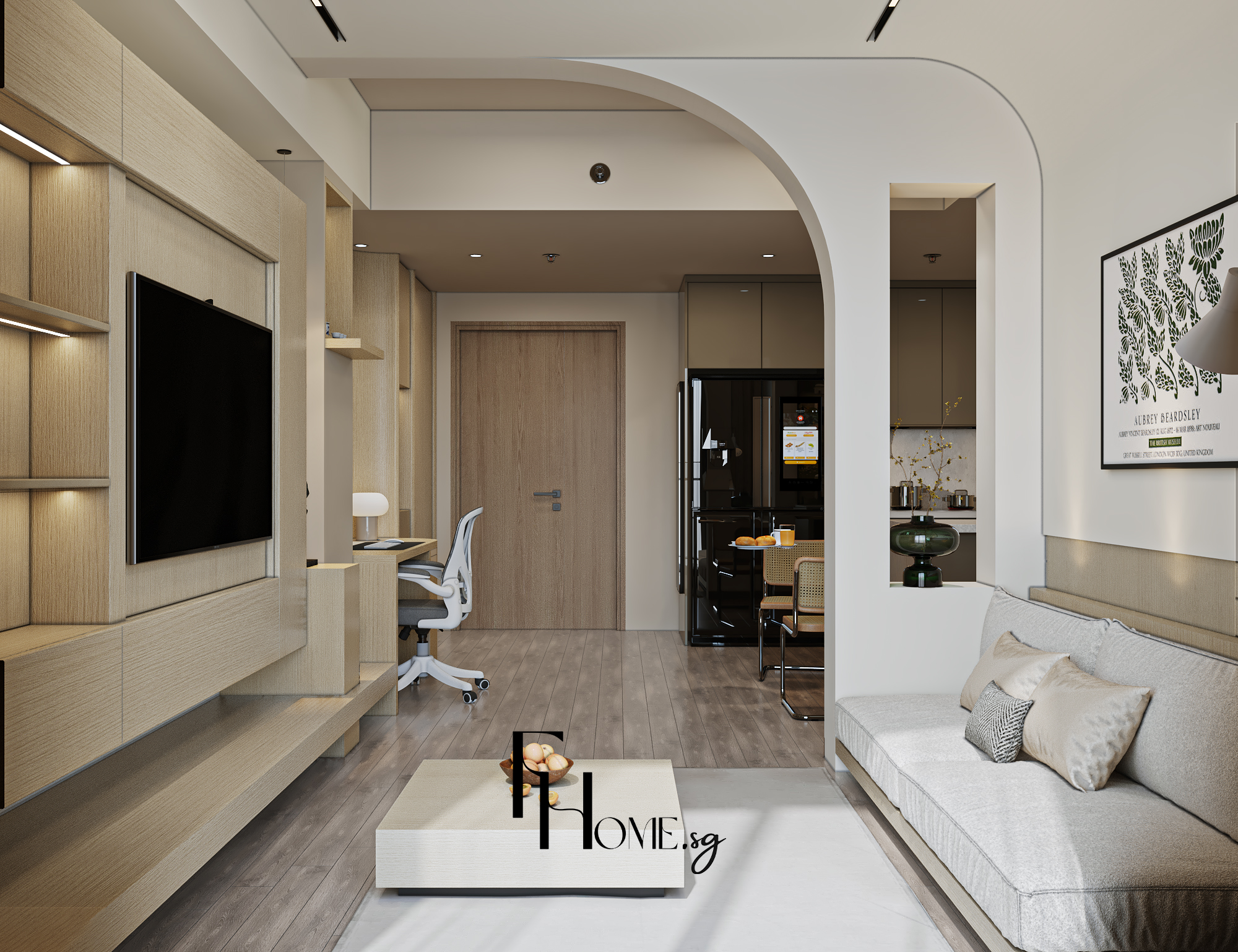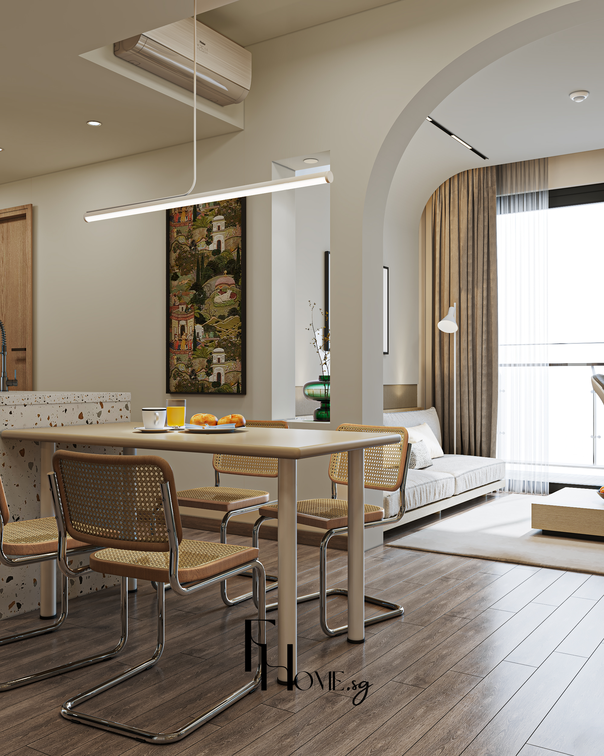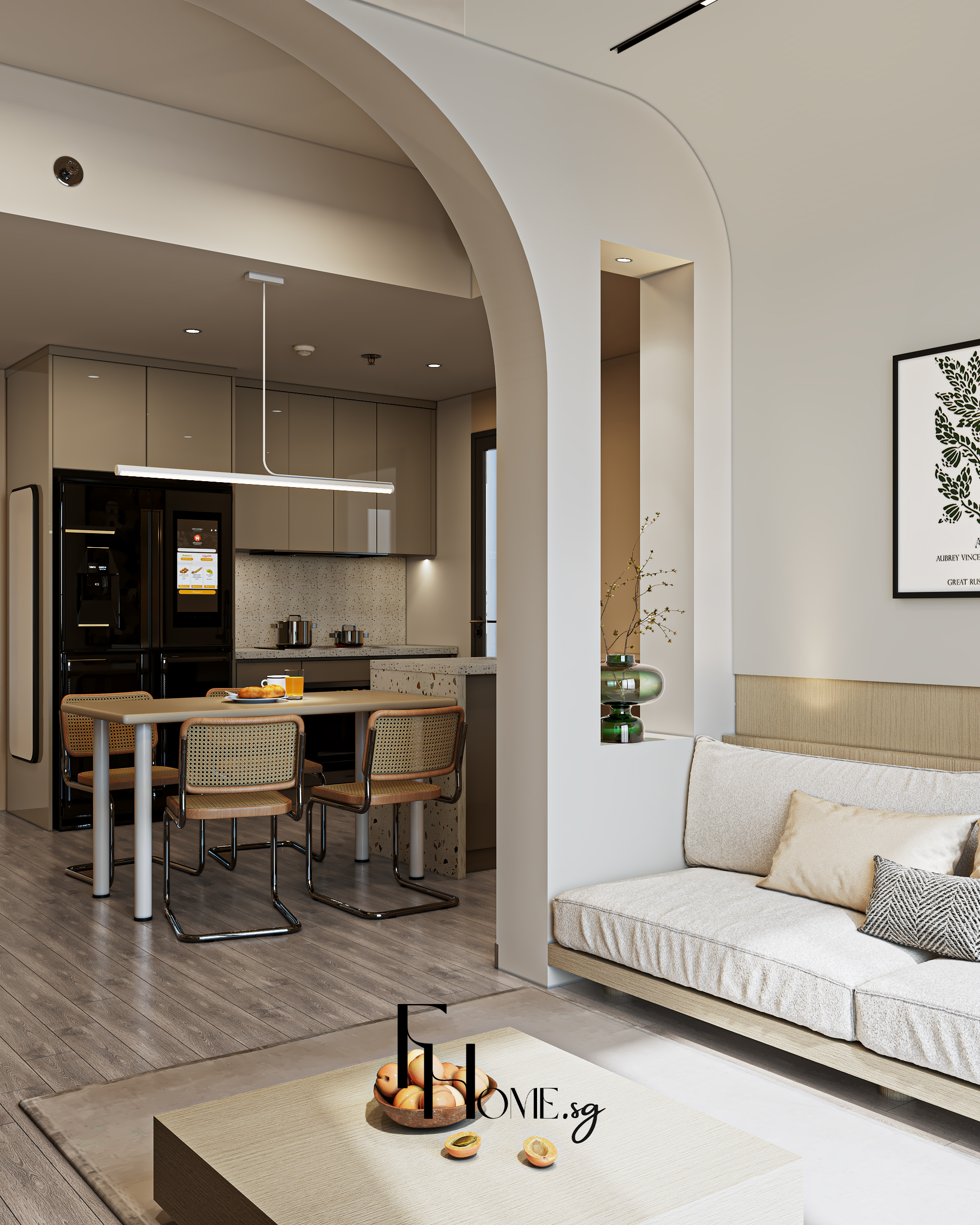 • Tối ưu Không gian: Mở rộng không gian thị giác bằng cách loại bỏ các vách ngăn, thay thế bằng Vòm cong (Arch) để tạo sự lưu chuyển mềm mại giữa phòng khách và bếp.