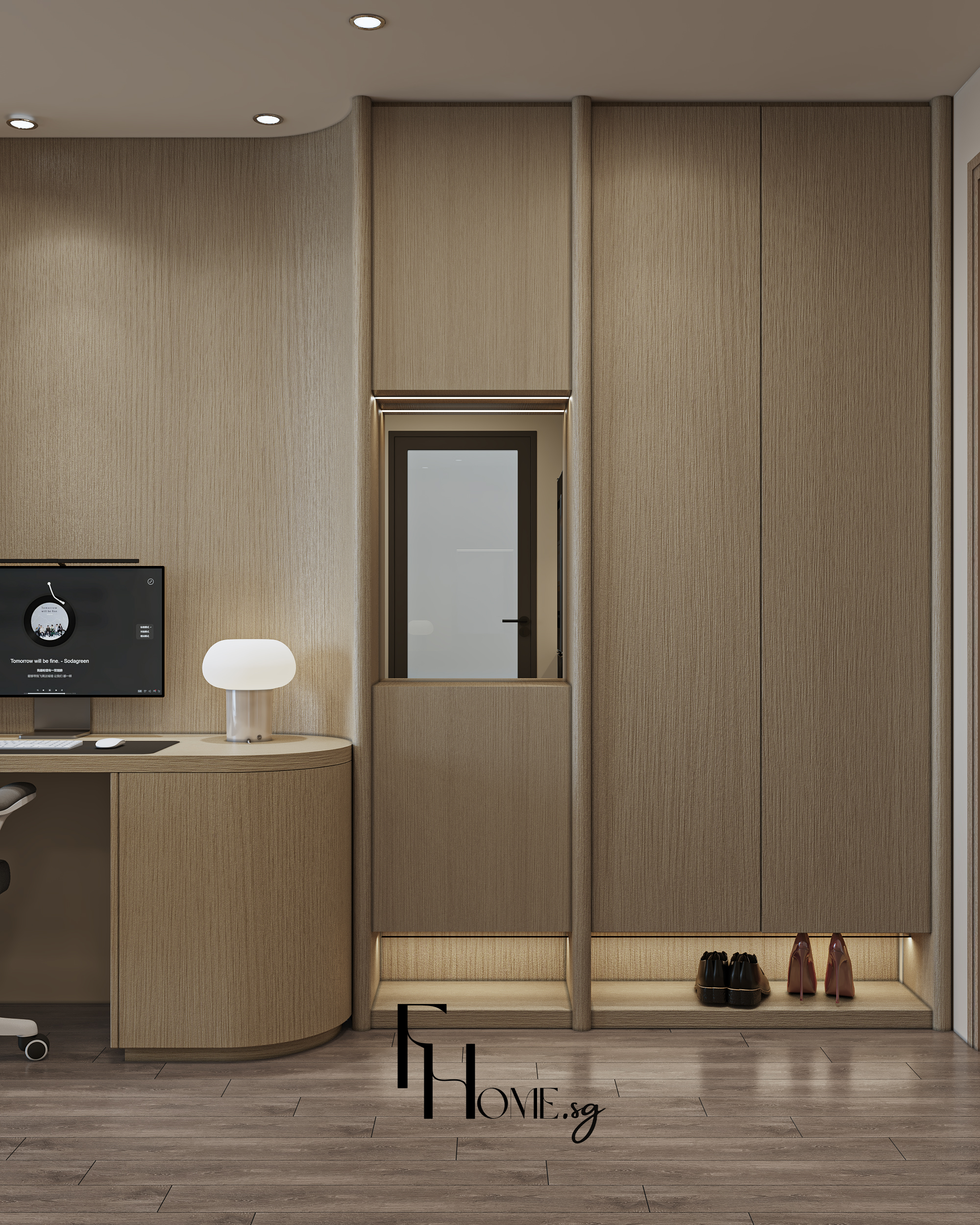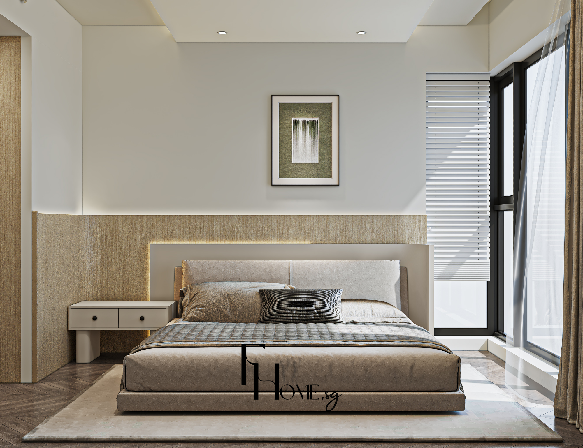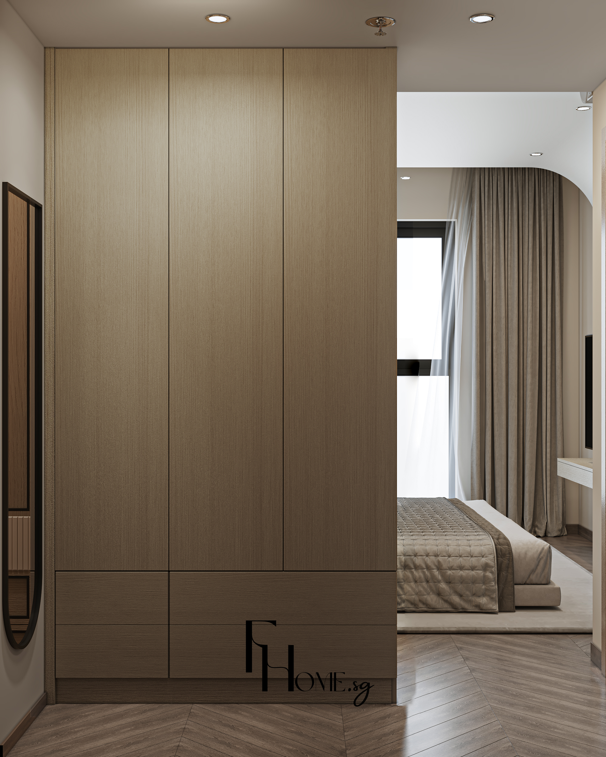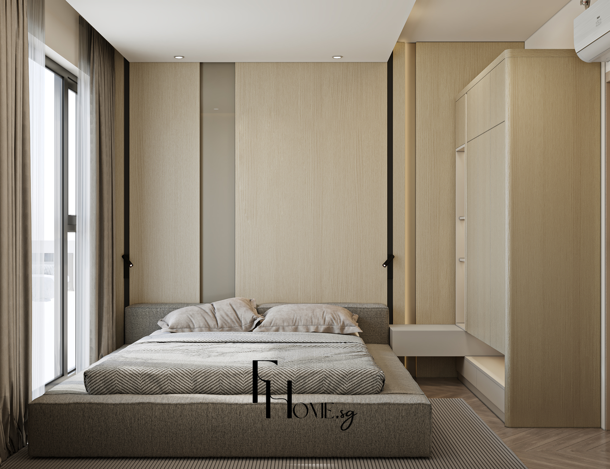 • Tích hợp Công năng: Thiết kế các hệ tủ kệ kịch trần, sử dụng cánh trượt trong phòng ngủ để tiết kiệm không gian.