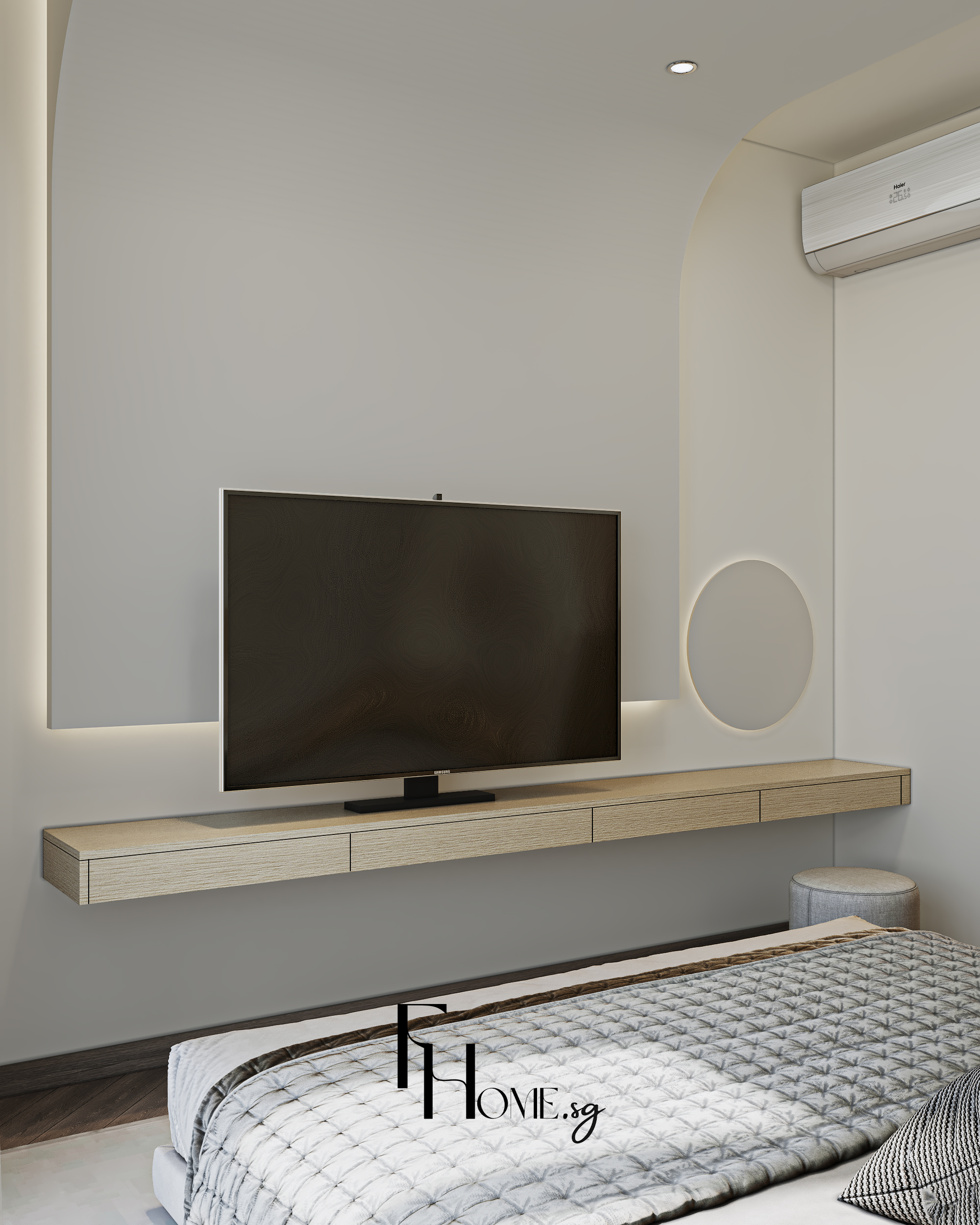 • Kỹ thuật: Thi công Hệ tủ kịch trần cánh phẳng không tay nắm, các chi tiết bo góc và vòm cong tinh xảo tại các điểm chuyển tiếp không gian.