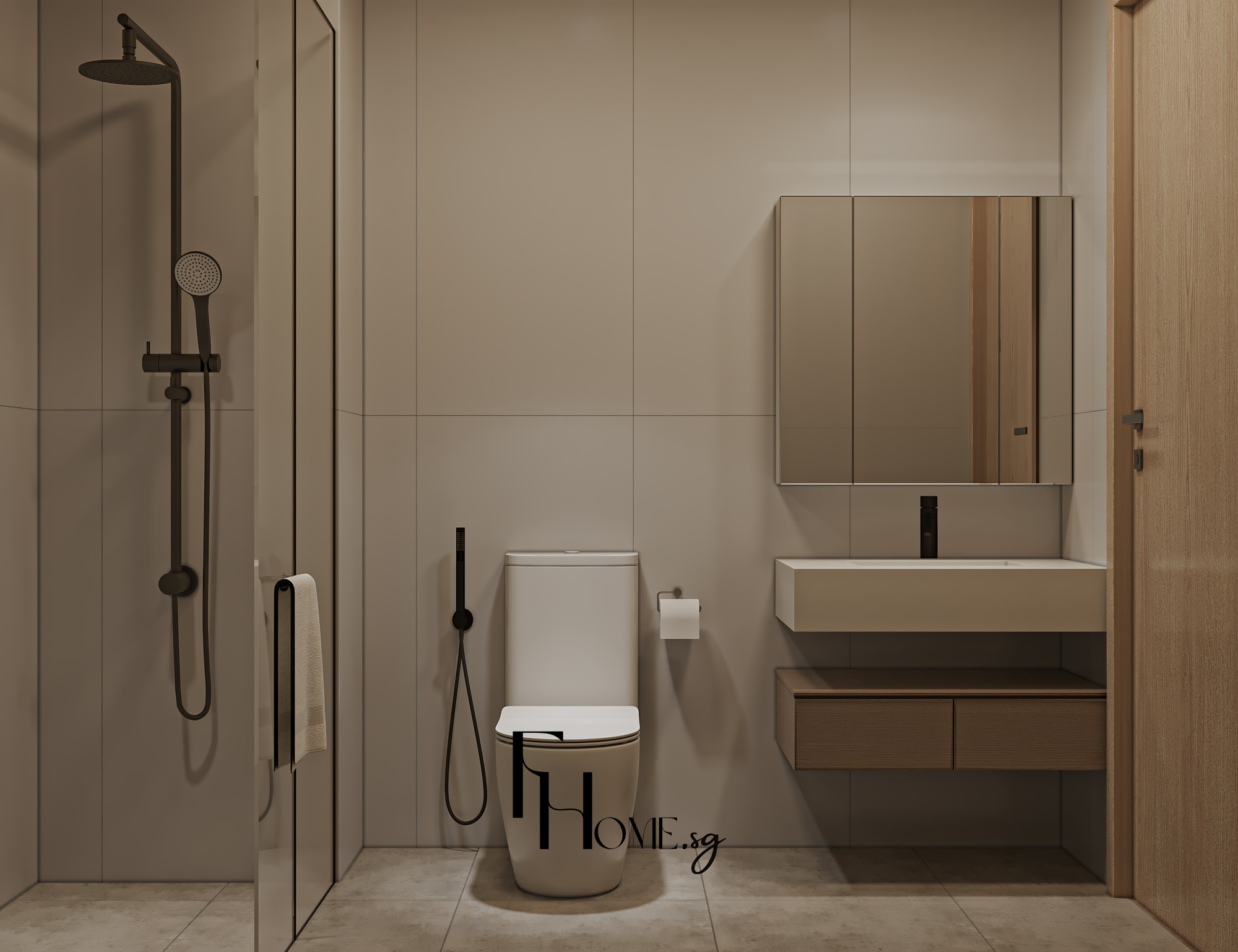 • Vật liệu: Gỗ công nghiệp Veneer/Laminate vân Sồi tự nhiên cho hệ tủ, vách trang trí. Sử dụng đá nhân tạo bề mặt mờ cho khu vực Lavabo và bếp.