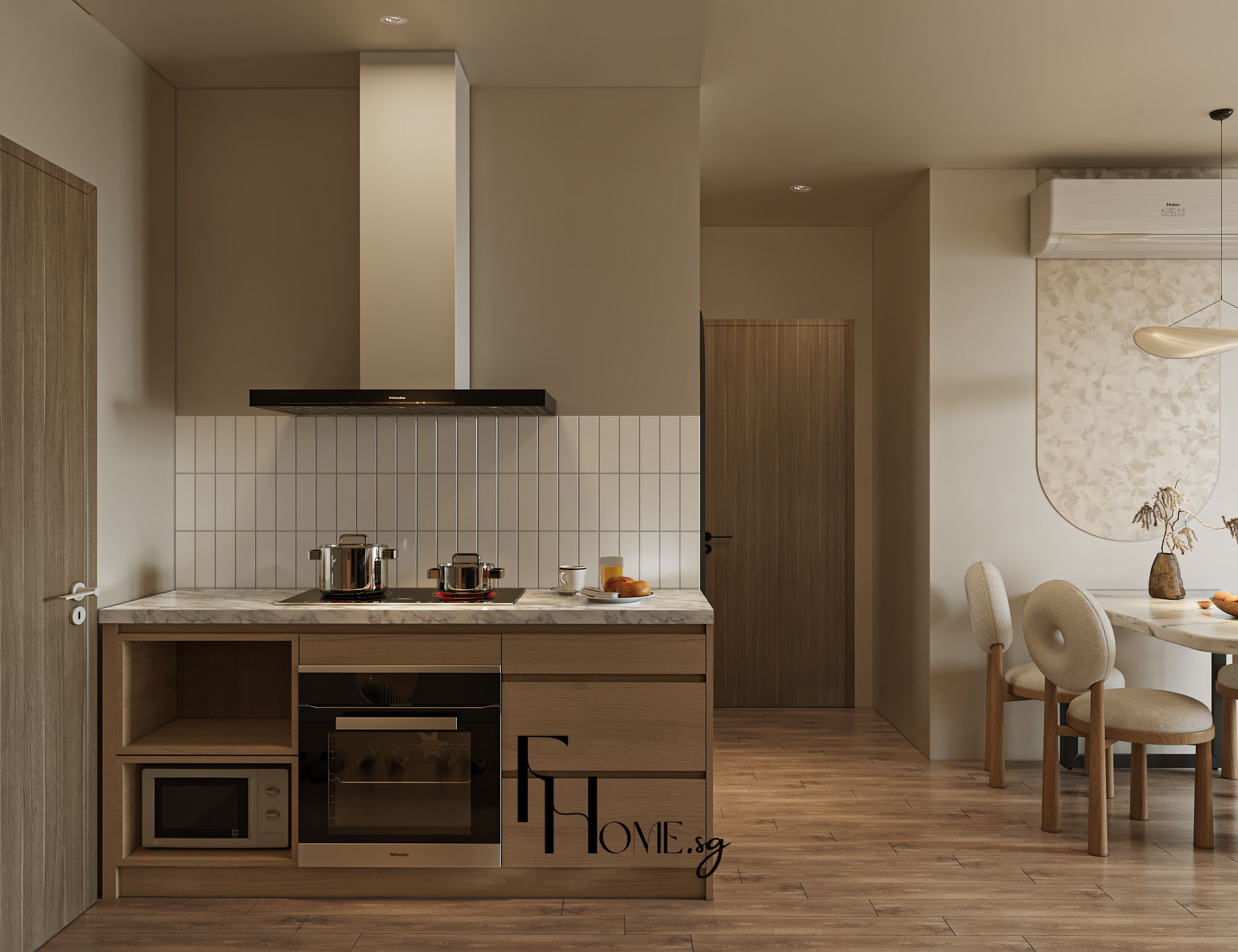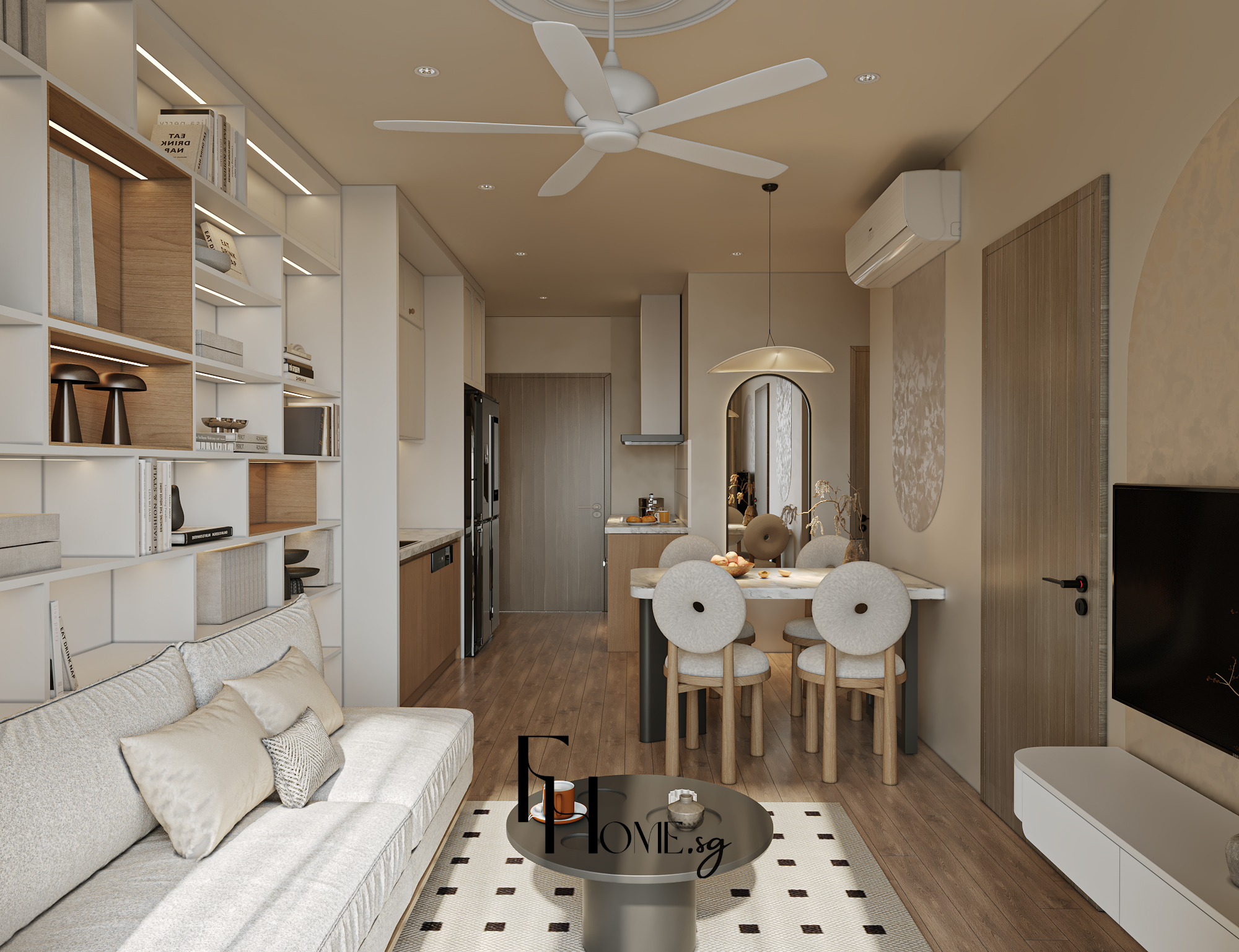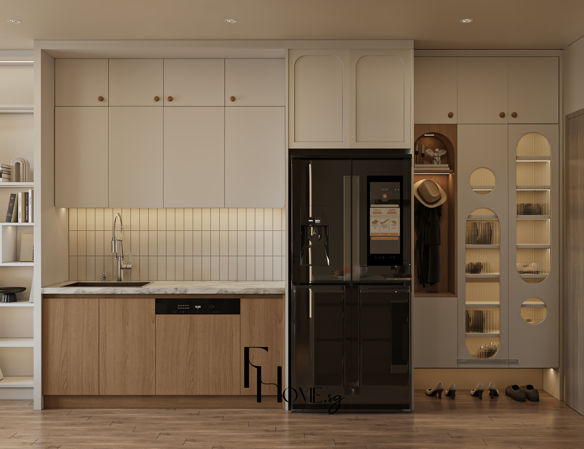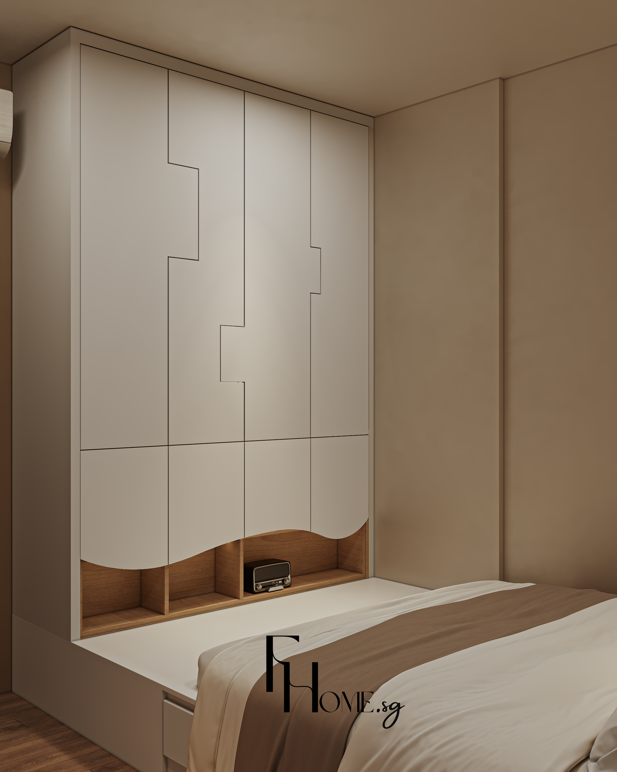 • Hoàn thiện: Toàn bộ sản phẩm nội thất gỗ được sản xuất và kiểm định chất lượng trực tiếp tại xưởng FHome.sg, đảm bảo độ gãy gọn của đường nét, tính đồng nhất của vật liệu và sự chuẩn xác trong lắp đặt hệ tủ kịch trần.