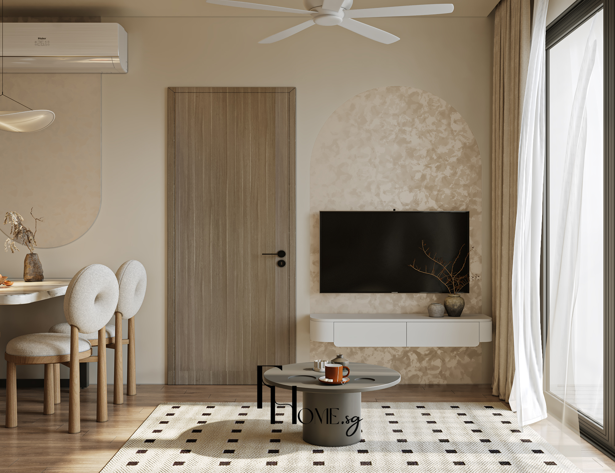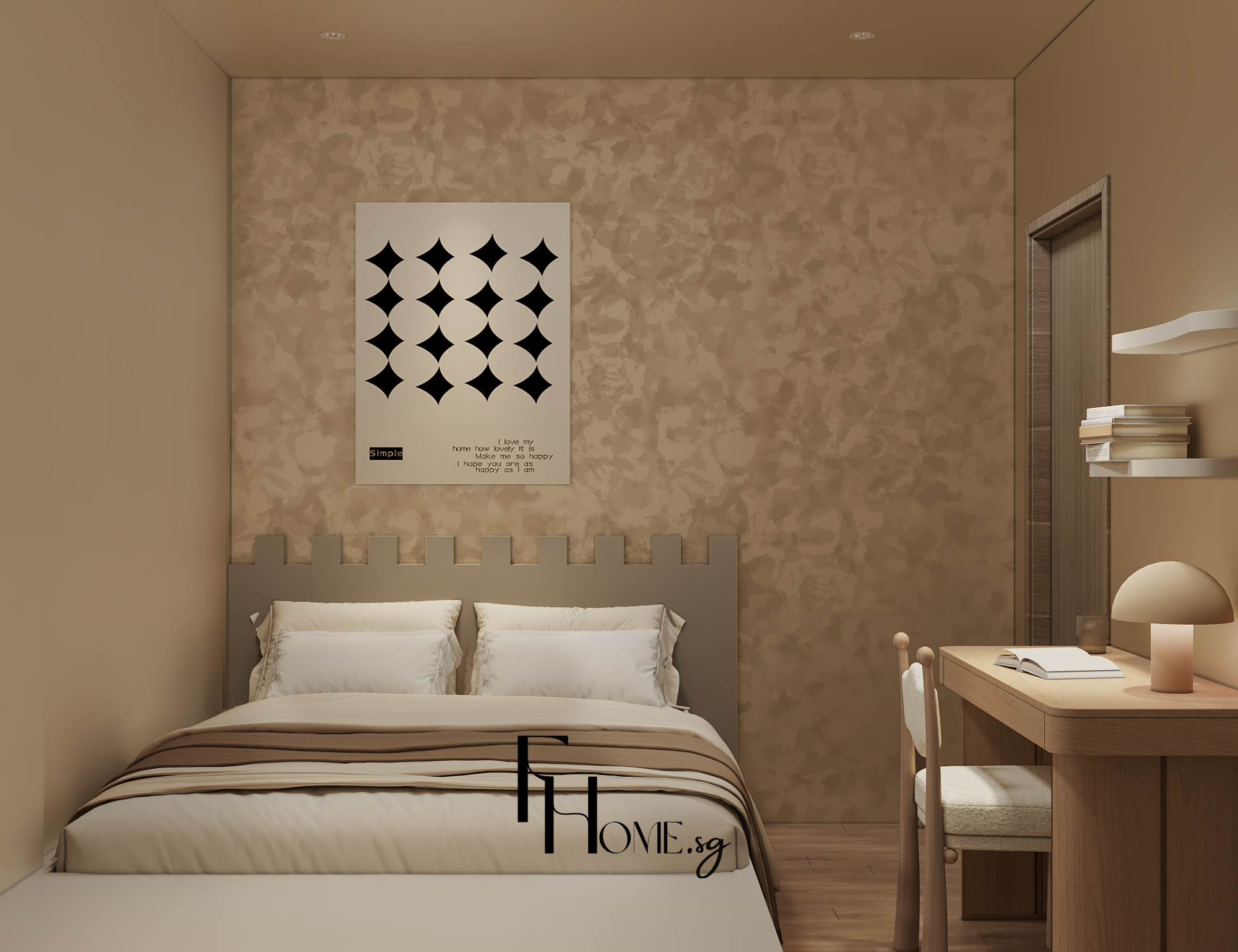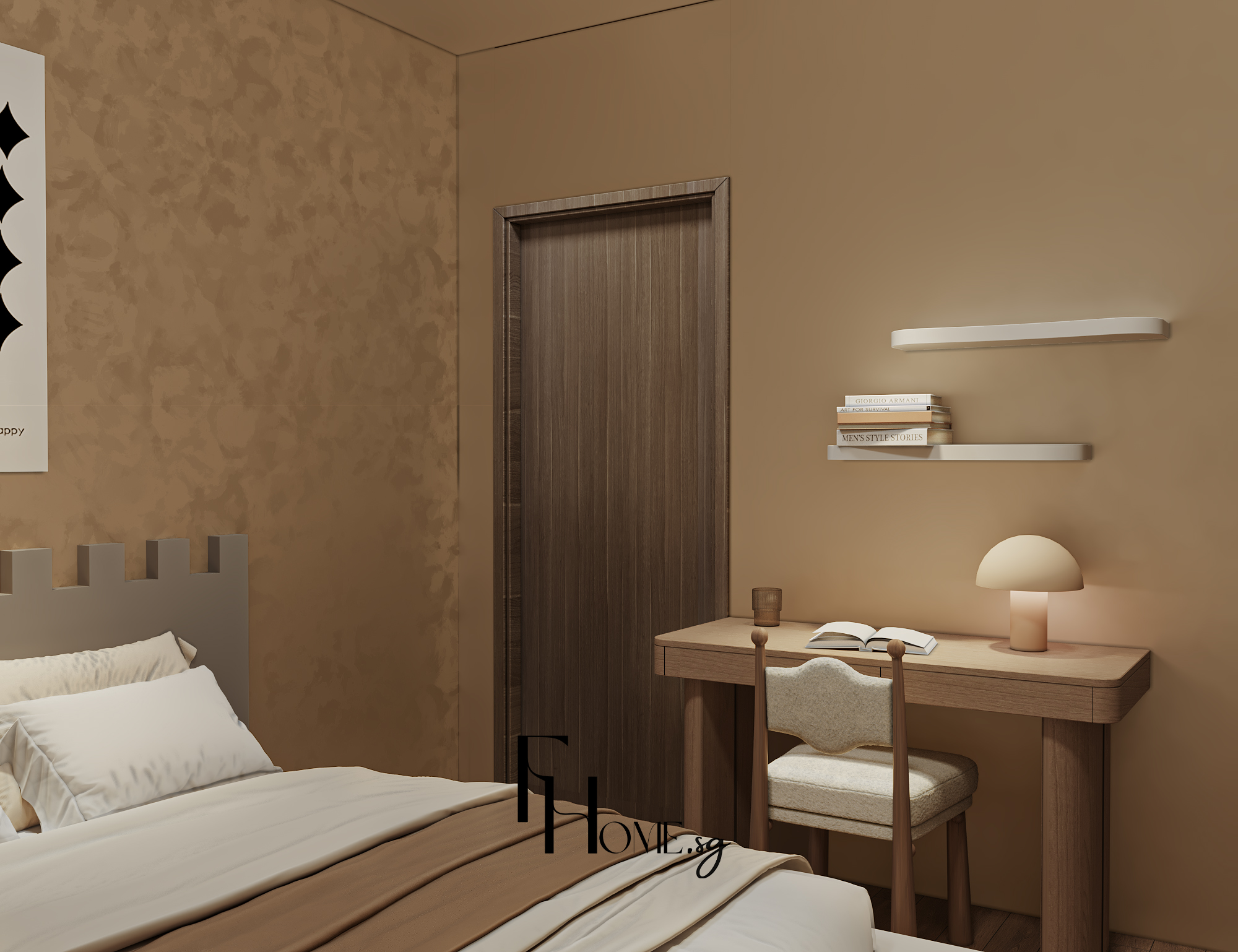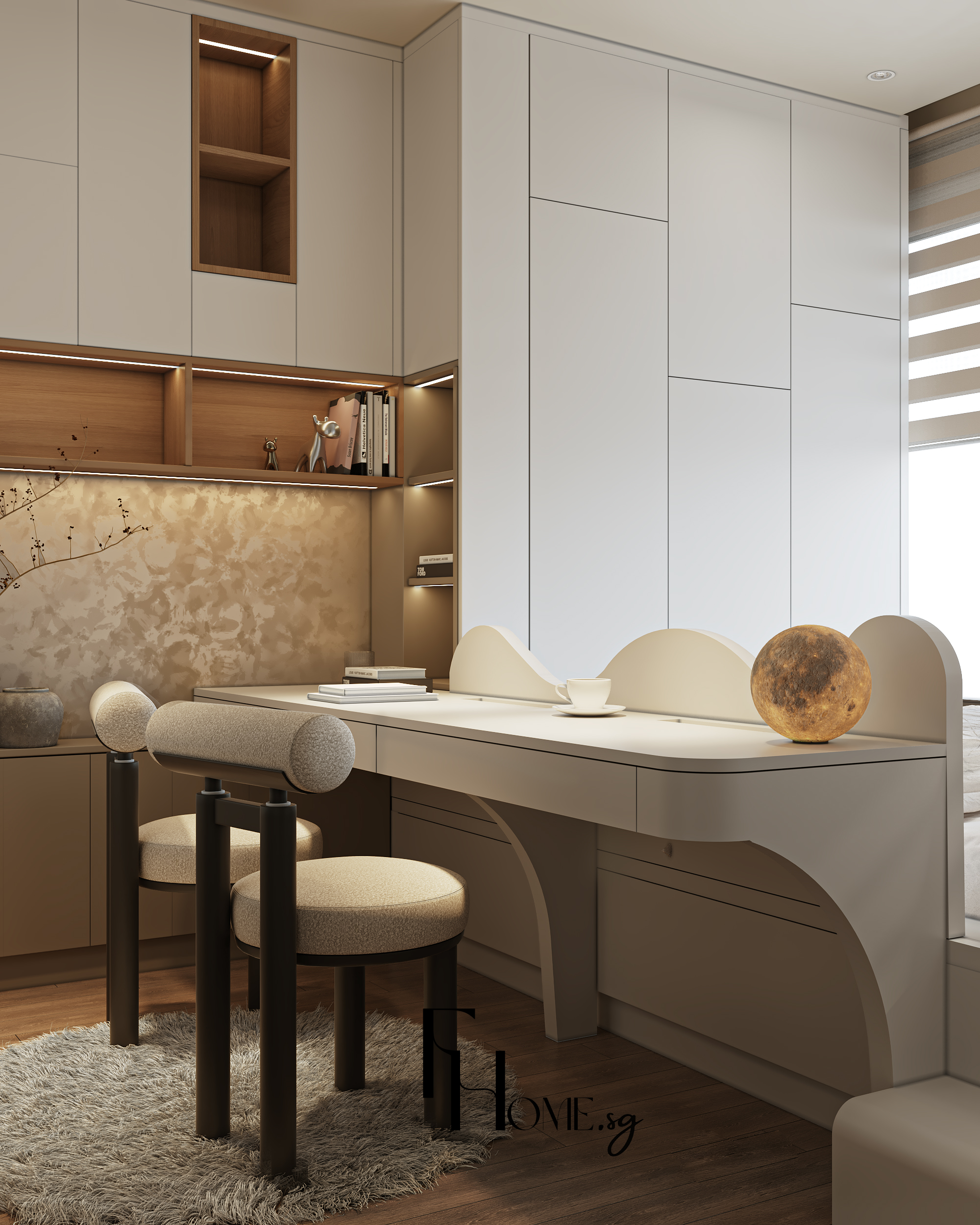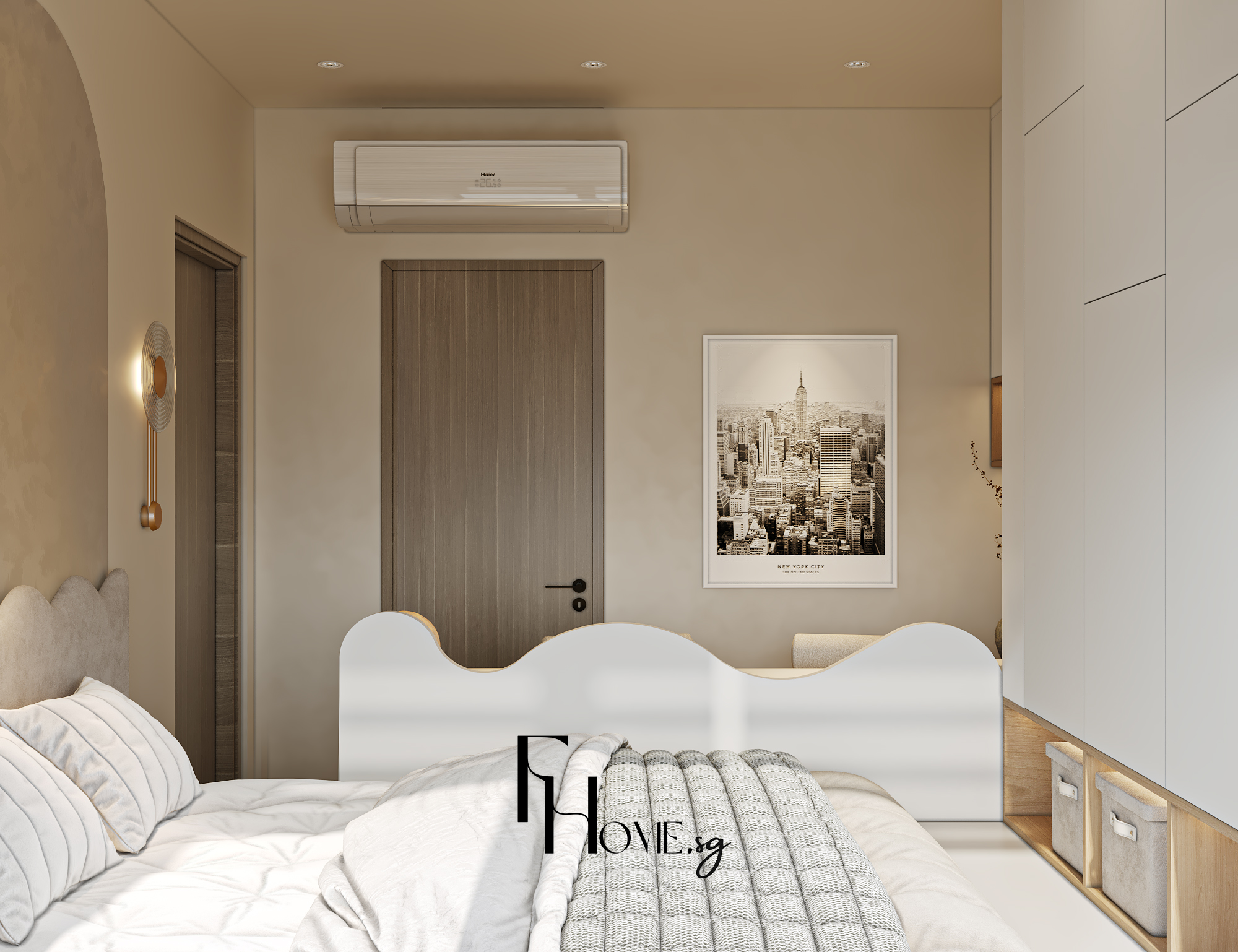• Hoàn thiện: Toàn bộ sản phẩm nội thất gỗ được sản xuất và kiểm định chất lượng trực tiếp tại xưởng FHome.sg, đảm bảo độ gãy gọn của đường nét, tính đồng nhất của vật liệu và sự chuẩn xác trong lắp đặt hệ tủ kịch trần.