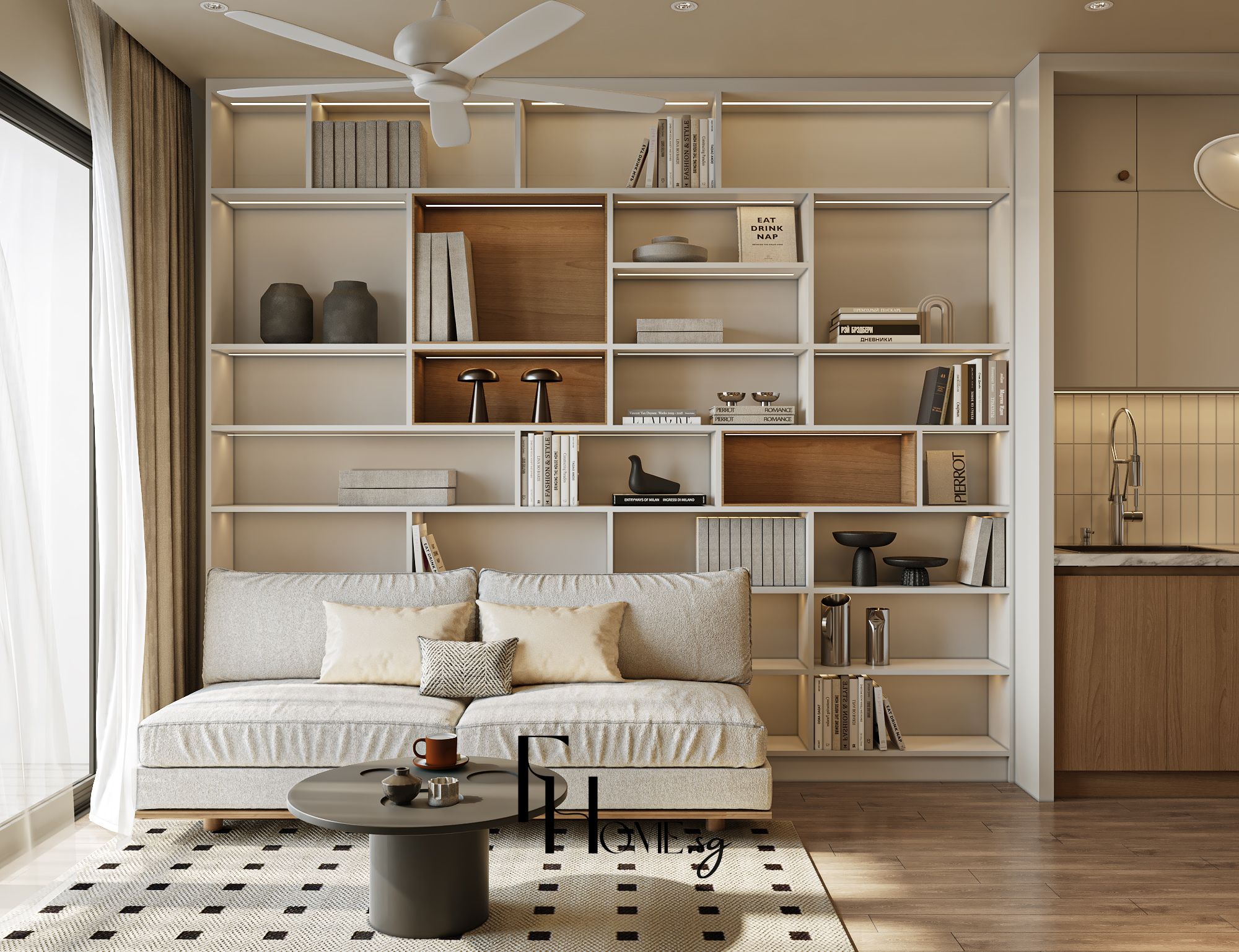 • Giải pháp Không gian: Tích hợp phòng khách, bếp và khu vực ăn uống vào một không gian mở. Sử dụng hệ kệ sách kịch trần màu trắng (giải phóng tầm nhìn) thay thế vách ngăn cứng, giúp mở rộng không gian thị giác và tăng khả năng lưu trữ lên tối đa.