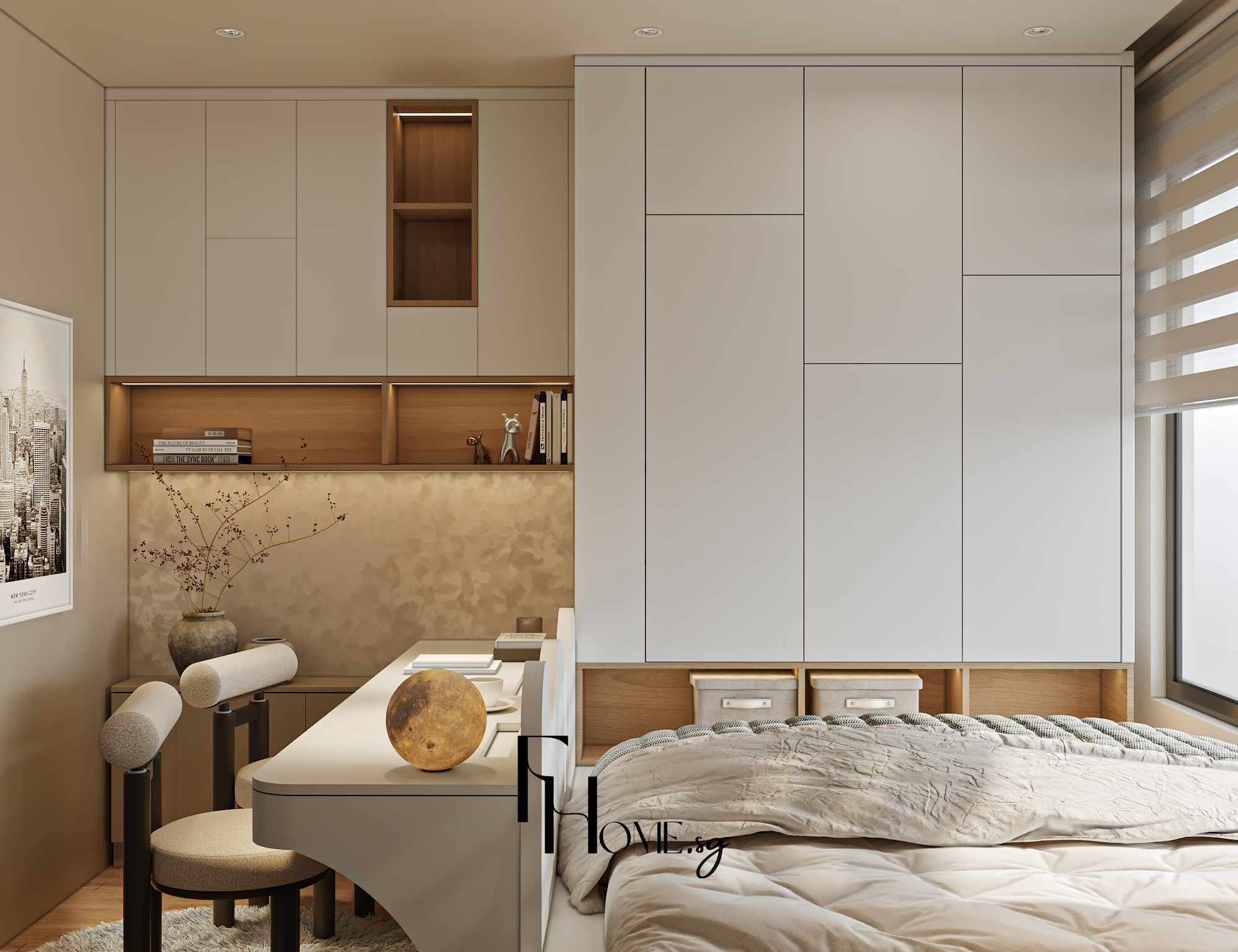 • Phòng ngủ: Thiết kế giường bệt kết hợp hệ tủ quần áo kịch trần, tối ưu hóa không gian phía dưới sàn và tạo cảm giác ấm cúng, liền mạch. Bàn làm việc/bàn trang điểm tích hợp khéo léo vào góc phòng, tận dụng ánh sáng tự nhiên.