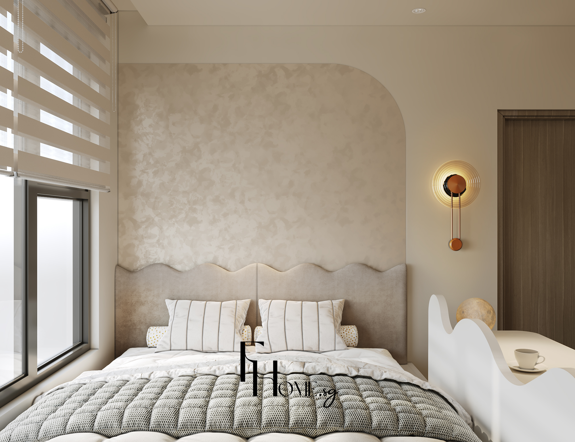 • Bề mặt: Lựa chọn sơn hiệu ứng hoặc giấy dán tường thô ráp/vải bố cho mảng tường đầu giường và mảng tường TV để củng cố tinh thần Wabi Sabi.
