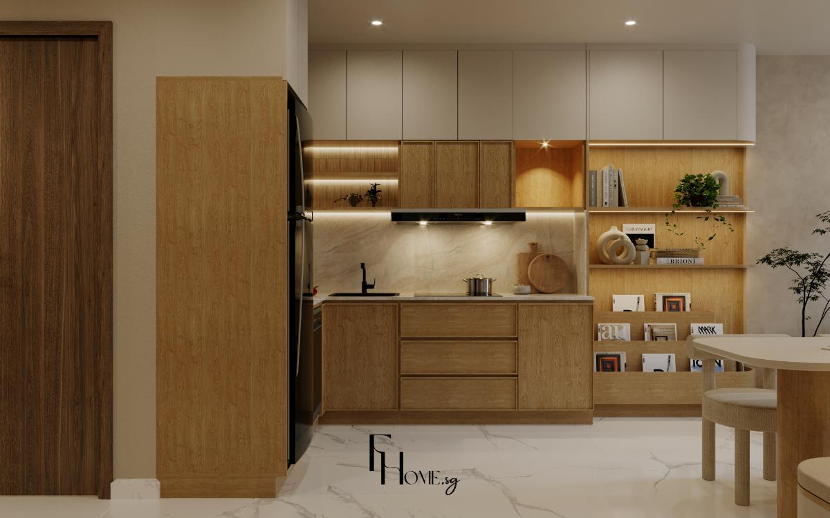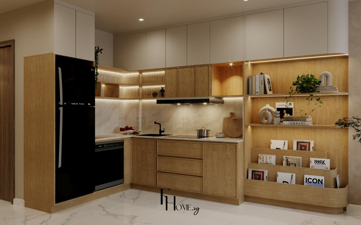 • Tối ưu không gian bếp bằng hệ tủ chữ L kết hợp kệ mở trang trí. Giải pháp này giúp khu vực nấu nướng trở nên thông thoáng, tiện dụng và giảm bớt sự nặng nề của các khối tủ kín.