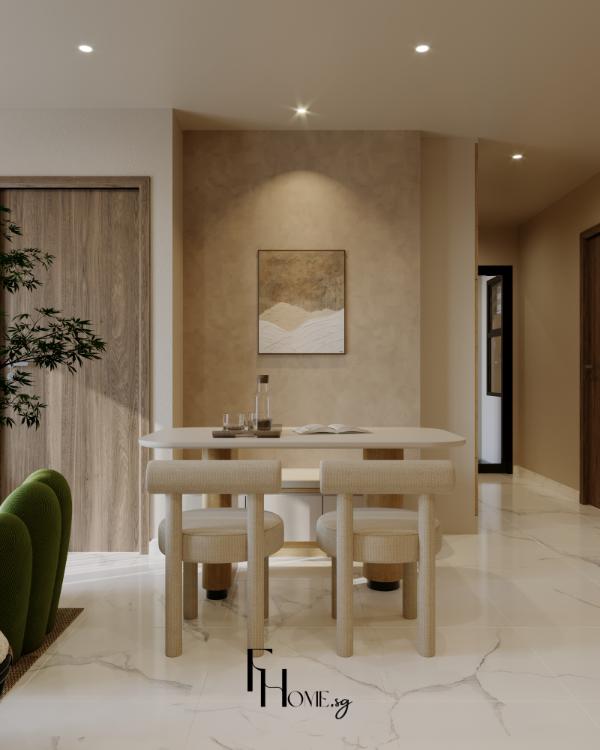 Thách thức: Căn hộ 68m2 cần đáp ứng nhu cầu sinh hoạt cho gia đình có trẻ nhỏ, đồng thời gia chủ mong muốn một không gian mang đậm dấu ấn cá nhân, vừa mộc mạc, bình dị kiểu Wabi Sabi, vừa gọn gàng, tinh tế kiểu Japandi.