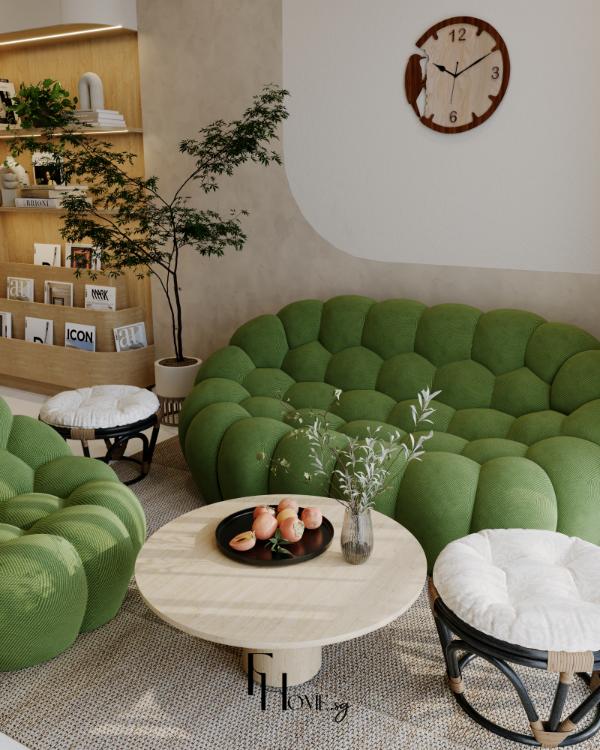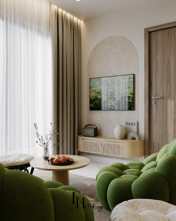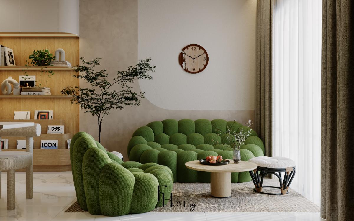 • Tạo điểm nhấn thị giác bằng việc sử dụng sofa màu xanh rêu độc đáo giữa nền không gian trung tính. Sự xuất hiện của màu xanh mang lại cảm giác tươi mát, kết nối với thiên nhiên và làm nổi bật cá tính của gia chủ.