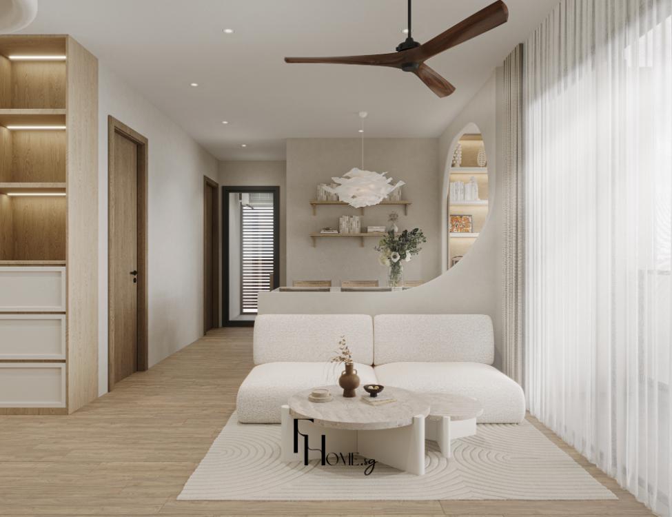 • Giải pháp Không gian: Mở rộng thị giác bằng cách áp dụng không gian mở và bảng màu trung tính (Beige/Gỗ sáng). Khắc phục sự cứng nhắc bằng các hình khối bo cong để tạo sự chuyển tiếp mềm mại giữa các khu vực.