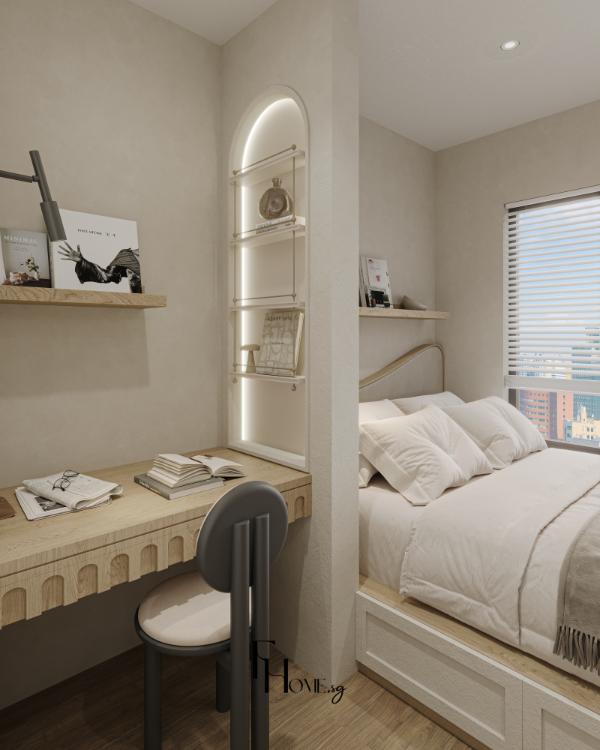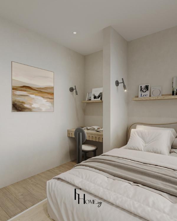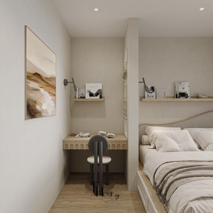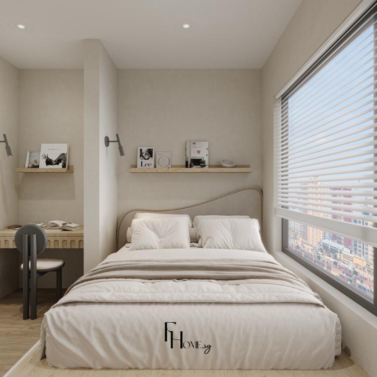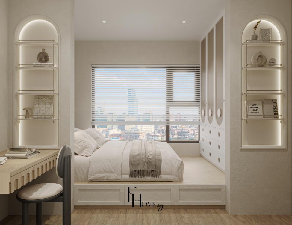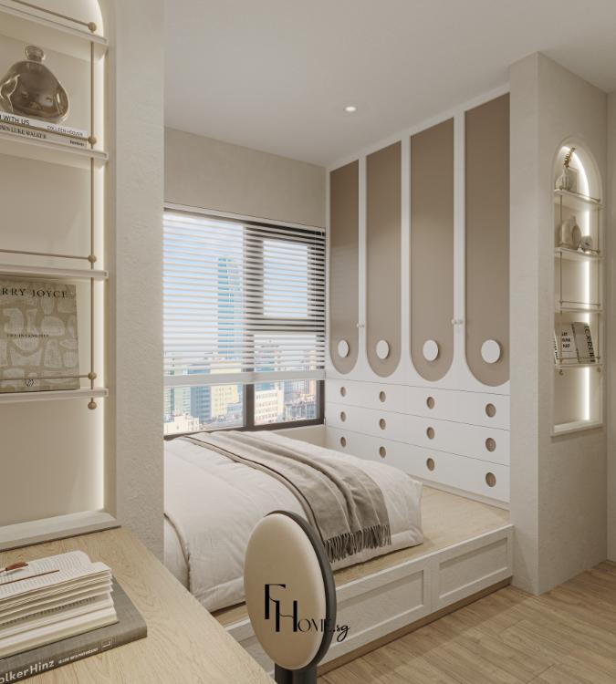 • Chi tiết Vật liệu: Gỗ công nghiệp Melamine/Laminate vân gỗ sáng cho toàn bộ hệ tủ và vách ốp; Sơn tường hiệu ứng vữa/bê tông màu trung tính; Nội thất rời sử dụng vải Linen, nỉ thô.