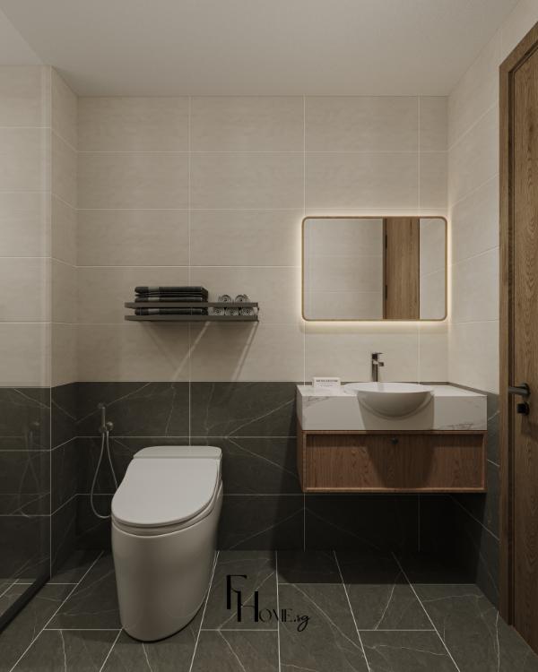 • Giải pháp Thẩm mỹ: Sử dụng sơn tường hiệu ứng thô mộc kết hợp ánh sáng ấm để tạo cảm giác tĩnh tại, đậm chất Wabi Sabi mà gia chủ yêu cầu.