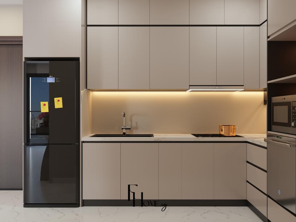 - Gỗ Công nghiệp: Sử dụng MDF lõi xanh chống ẩm phủ Melamine/Laminate (tone Be/Trắng Sáng) cho hệ tủ bếp, tủ quần áo và kệ lưu trữ, kết hợp cánh tủ màu Đen/Ghi để tạo sự tương phản.