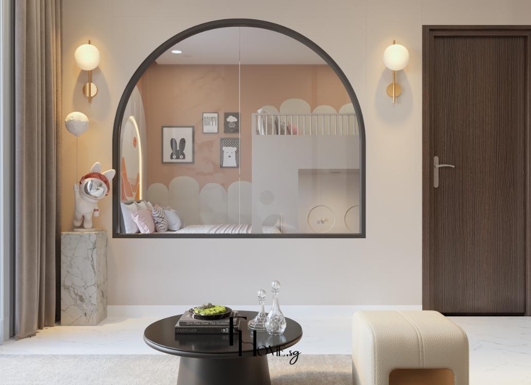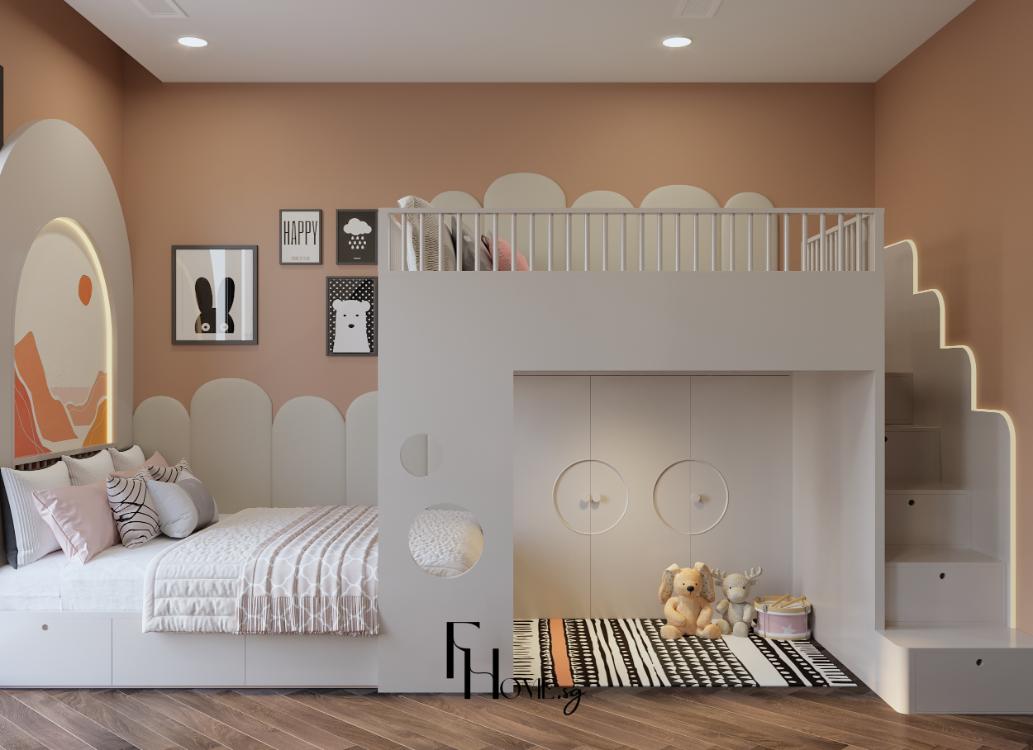 - Đa năng & Thẩm mỹ: Bố trí hệ giường tầng tích hợp tủ quần áo, kệ sách trong Phòng ngủ trẻ em, khắc phục vấn đề diện tích hẹp. Sử dụng các đường nét vòm congtrên tủ và gương để tạo cảm giác mềm mại, ấm cúng và tránh sự khô cứng thường thấy của phong cách Hiện đại.