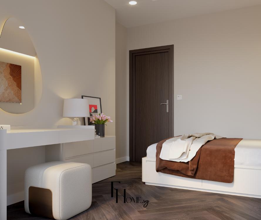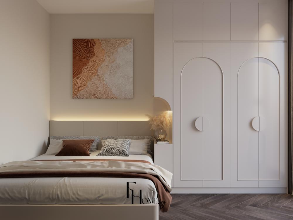 - Tối ưu Không gian: Tích hợp hệ tủ kịch trần và các tủ lưu trữ vào mọi không gian (Phòng bếp, Phòng ngủ). Mở rộng không gian thị giác bằng cách sử dụng tone màu Be/Trắng sáng chủ đạo và gương trang trí dáng cong (Phòng khách).
