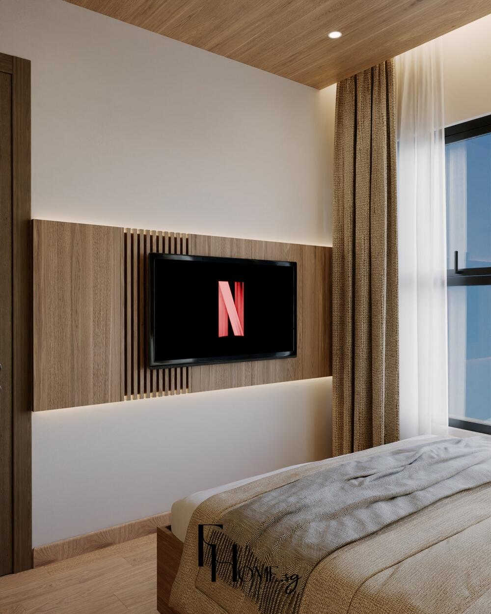 - Tích hợp Công năng: Thiết kế toàn bộ hệ tủ liền tường kịch trần, sử dụng phương pháp “giấu” tay nắm để bề mặt phẳng, giảm cảm giác nặng nề. Sử dụng ốp trần gỗ xuyên suốt, tạo chiều sâu thị giác và sự kết nối mạch lạc giữa các phòng.